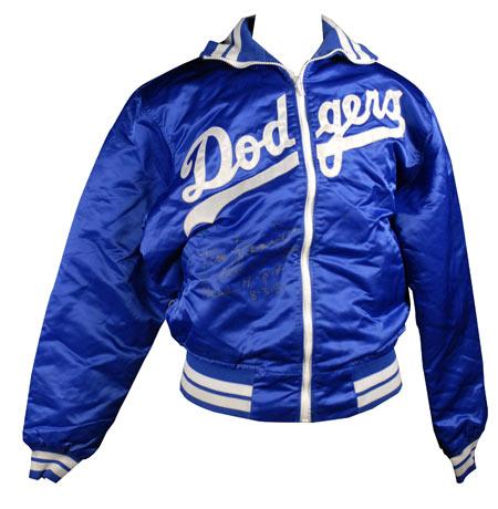 Starter Los Angeles Dodgers long sleeve zip up jacket, signed on the front in gold ink, “Tom Lasorda, I bleed Dodger Blue, HOF 8.3.97.” In fine condition, with light overall wrinkling, and some scattered light soiling to front.