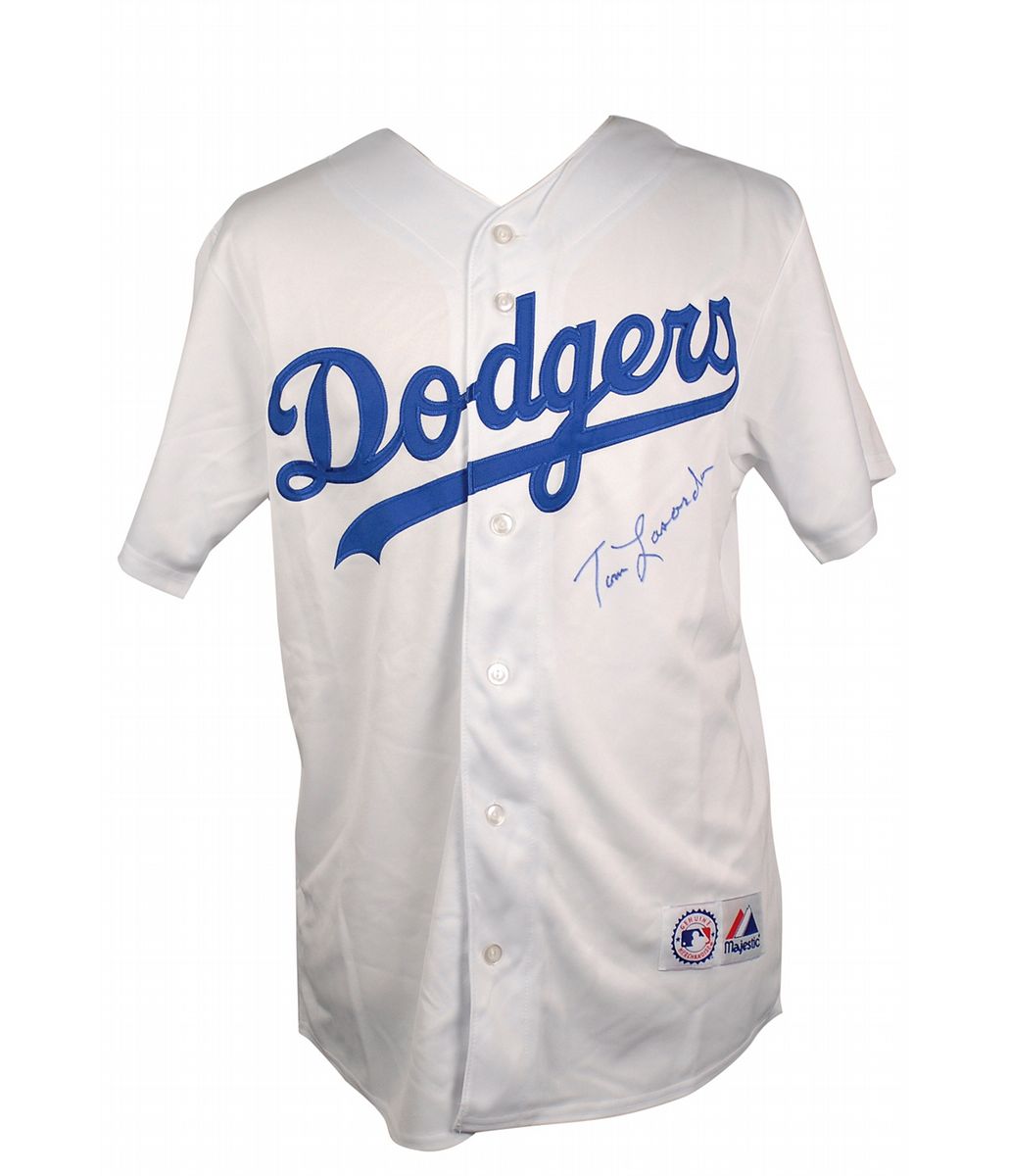 Official Majestic replica Los Angeles Dodgers baseball jersey, with sewn on letters and numbers, signed in blue felt tip on the front, “Tom Lasorda.” In fine condition. Accompanied by a certificate of authenticity from JSA.