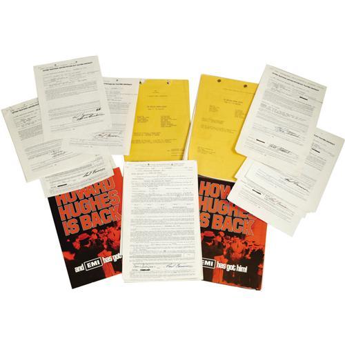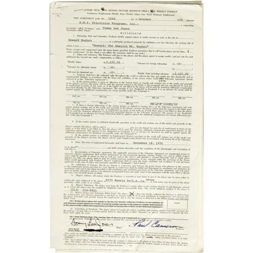 <B>Tommy Lee Jones and Others Signed "The Amazing Howard Hughes" Contract Archive.</B></I> Includes contracts for the 1977 TV biopic miniseries signed by Tommy Lee Jones, Ed Harris, Howard Hesseman, Dabney Coleman, Tovah Feldshuh, Morgan Brittany, Ed Flanders, Billy Baldwin, and Billy Bob Thornton; scripts for parts I and II; press clippings, a promotional brochure, and letters to former Hughes aide Noah Dietrich. Items are in overall Very Fine condition with mild wear.<BR><BR><b>Shipping:</b> Flat Material, Large (<a target="_blank" href="http://www.heritageauctions.com/common/shipping.php">view shipping information</a>)