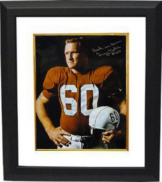 Tommy Nobis is one of college football’s all-time greatest linebackers. In his tenure with the Texas Longhorns (1963–1965) he averaged nearly 20 tackles a game and, as the only sophomore starter, was an important participant on the Longhorns’ 1963 National College Football Championship team, which defeated Heisman Trophy winner Roger Staubach in the Cotton Bowl Classic. Nobis was a two time All-American and made the All-Southwest Conference team three times. In the 1965 Orange Bowl, Nobis made one of the most famous tackles in the game’s history. On fourth-and-inches, and clinging to a 21-17 lead, he led his teammates to a game saving halt of top ranked Alabama’s QB Joe Namath. Tommy Nobis has hand autographed this Texas Longhorns 16x20 Color Photo with Hook Em Horns inscription. Certificate of Authenticity from Athlon Sports. Custom White Mat and Premium Black Frame as shown