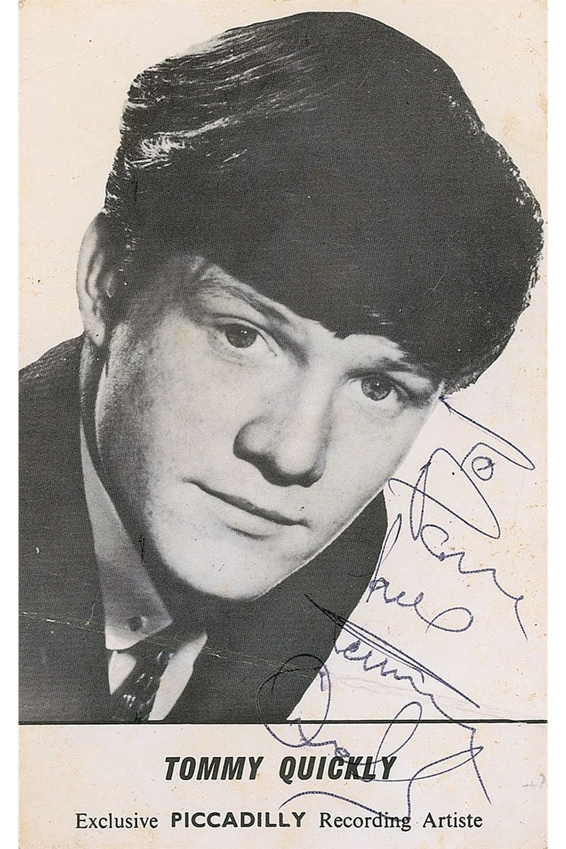 Vintage 3.5 x 5.5 Piccadilly Records promo card photo, signed and inscribed in blue ballpoint, “To Pam, Love, Tommy Quickly.” Noticeable creasing to lower portion of card, lightly affecting part of the signature, and some other scattered light creasing an