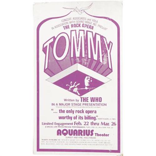 <B>Tommy Rock Opera Aquarius Theater Counter Stand-Up Display (1972).</B></I> Pete Townsend's classic rock opera, in its first theatrical stage adaptation, was promoted with this purple on metallic sliver stand-up display. It measures 13" x 22", and is in VG condition. Slightly scuffed, but still attractive; the stand-up fold-out on the back is in excellent condition.<BR><BR><b>Shipping:</b> Flat Material, Large (<a target="_blank" href="http://www.heritageauctions.com/common/shipping.php">view shipping information</a>)