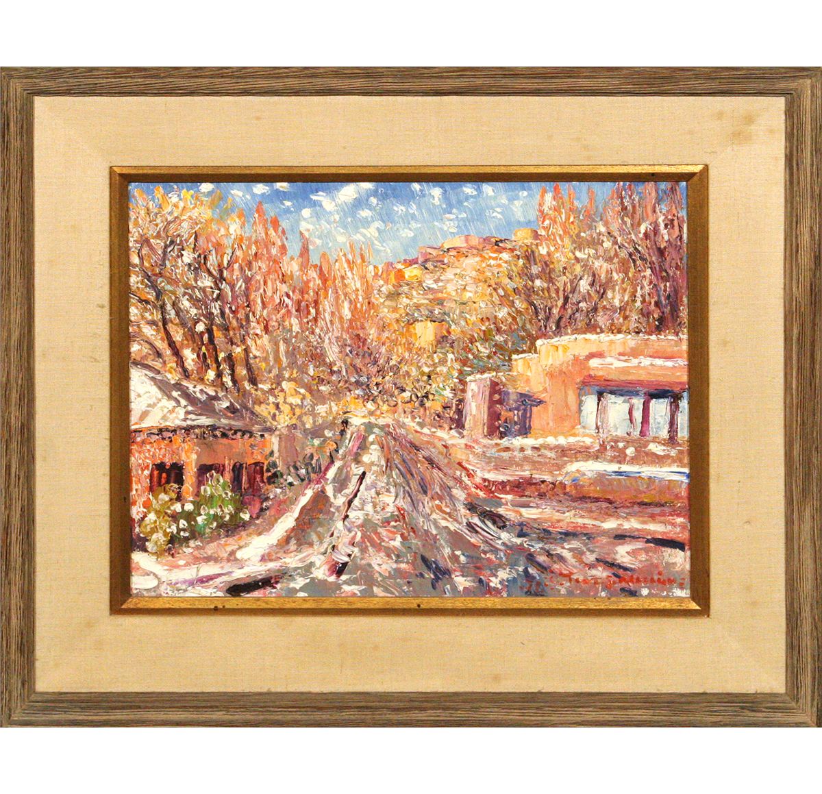 Tommy S. Macaione (1907 - 1992). Palace and Canyon Roads. 14" x 18" oil on canvas. Signed lower right: © TOM S. MACAIONE. Also signed verso.
