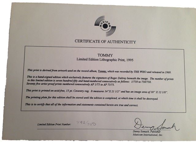 Tommy Limited Edition Lithographic Print, 1995. The print is derived from artwork used on the record album which was recorded by The Who and released in 1969. This is a hand signed edition which exclusively features the signature of Roger Daltry beneath the image. Print is on acid free, 15pt. coventry rag. #492/750. Framed in plexi glass. Black, wood frame is has white paint marks and shows some wear. Includes Certificate of Authenticity from Musicom and a color photo of him signing the artwork. (40"x24")