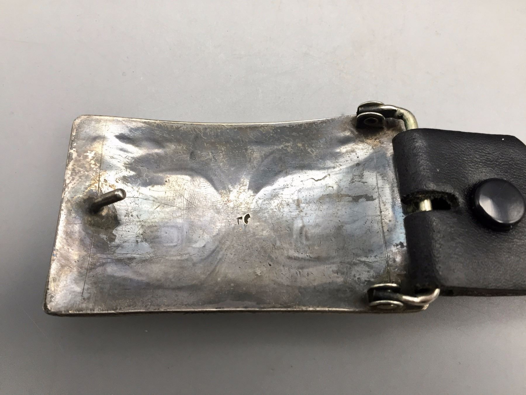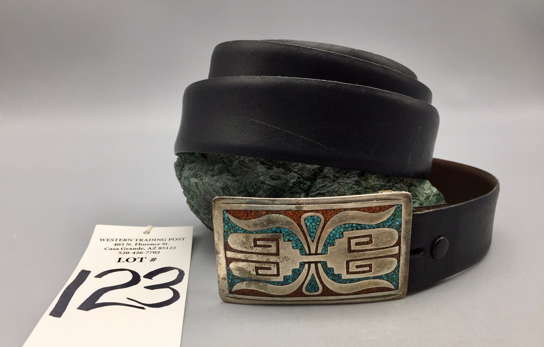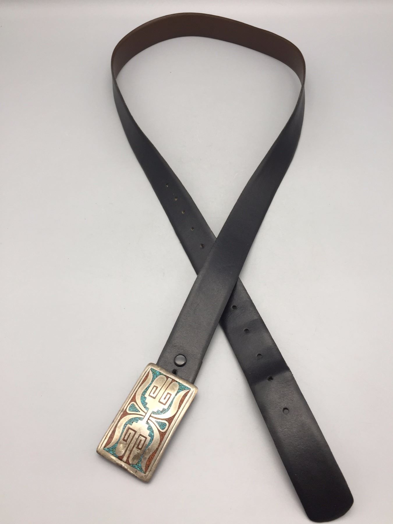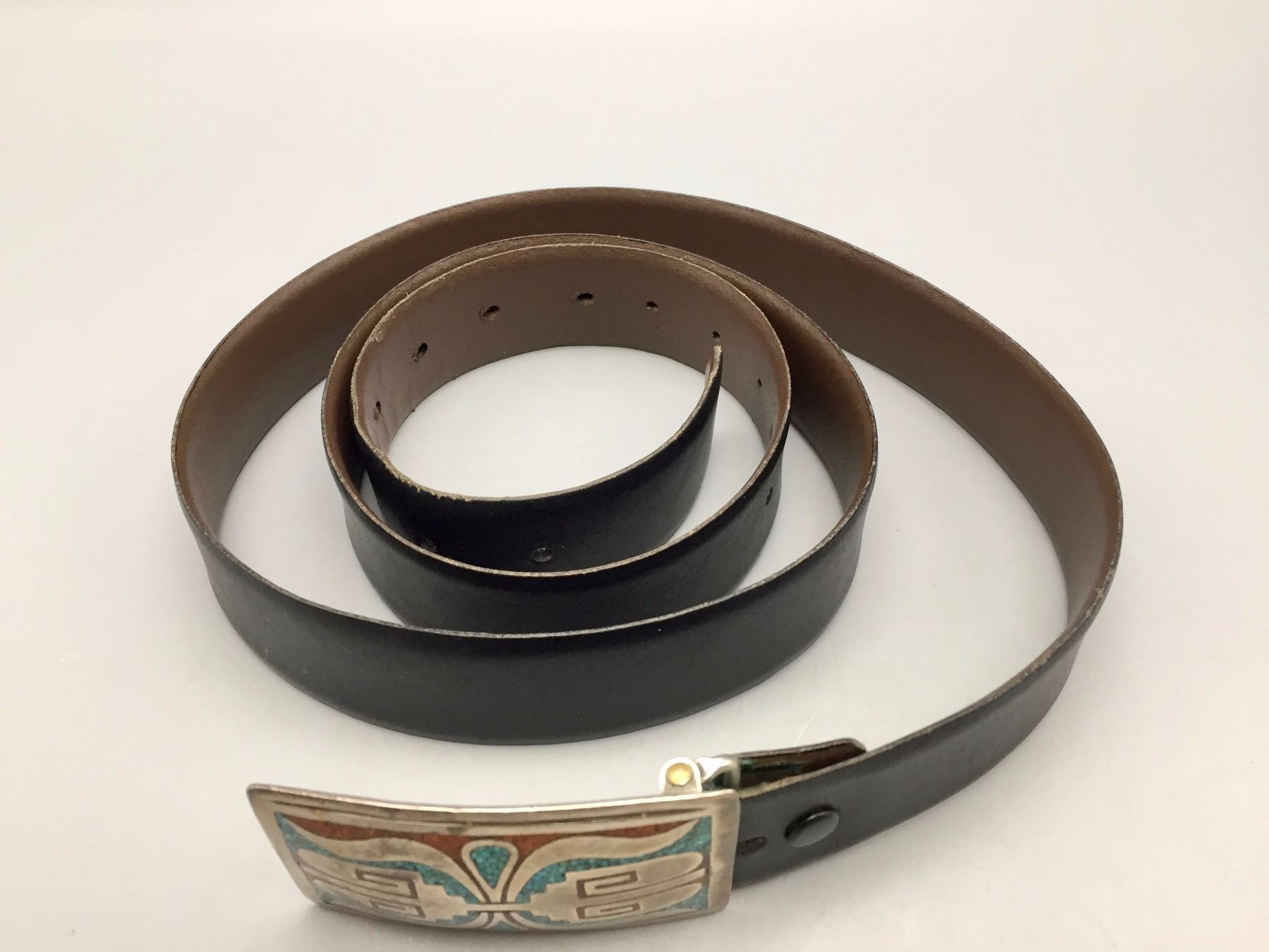 Description: A nice turquoise, coral and sterling silver chip inlay belt buckle on a black belt. Buckle was created by known silversmith Tommy Singer who was credited with inventing this style. Tested as sterling silver. Maker: Tommy Singer (1940-2014). Approx. Age: 1960s - early 1970s. Size: Buckle measures: 3-1/8”w x 1-3/4”h. Fits approx. 1-1/2” belt. Belt measures 52” long. Combined weight: 164.8 grams. Condition: Good for its age, normal wear expected. Please look closely at the pictures - they are an important part of our description. Shipping: There will be a $5 handling / packaging fee for shipping this lot. The actual cost of postage will be added on top of that.