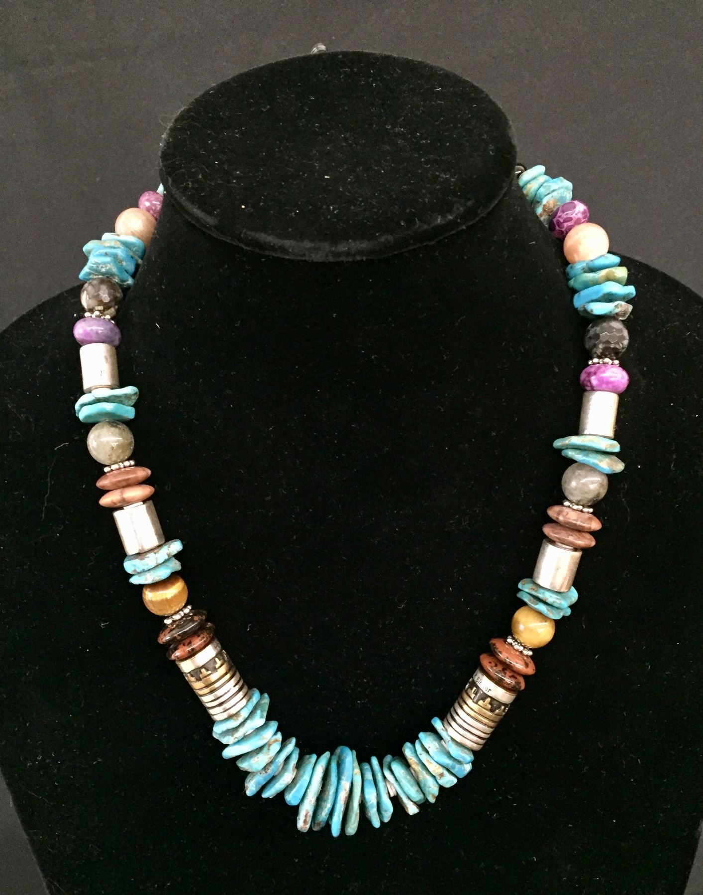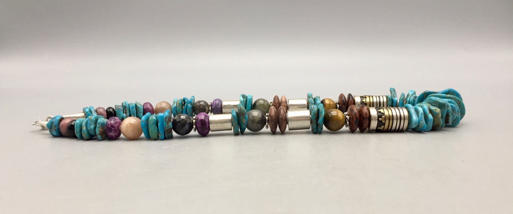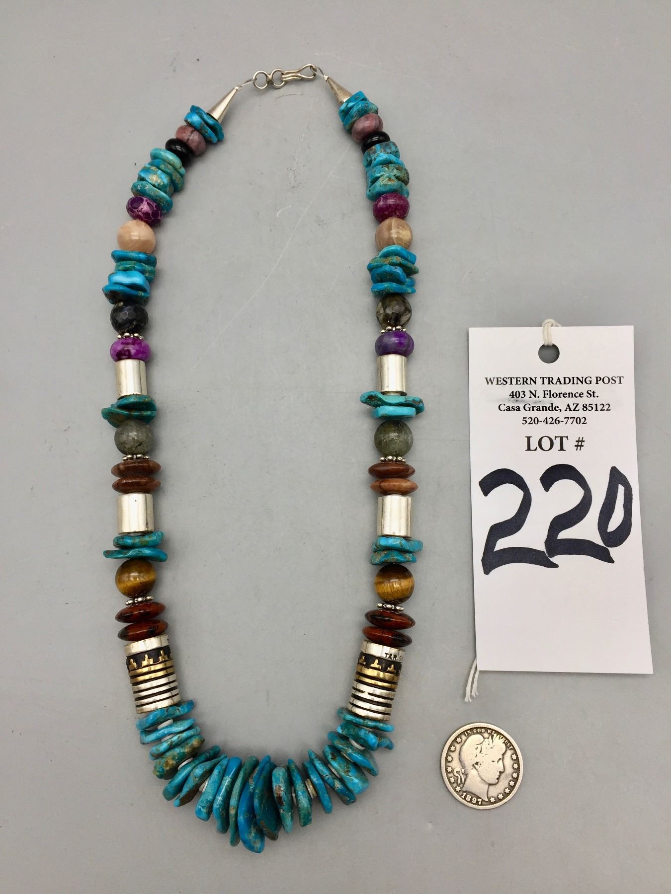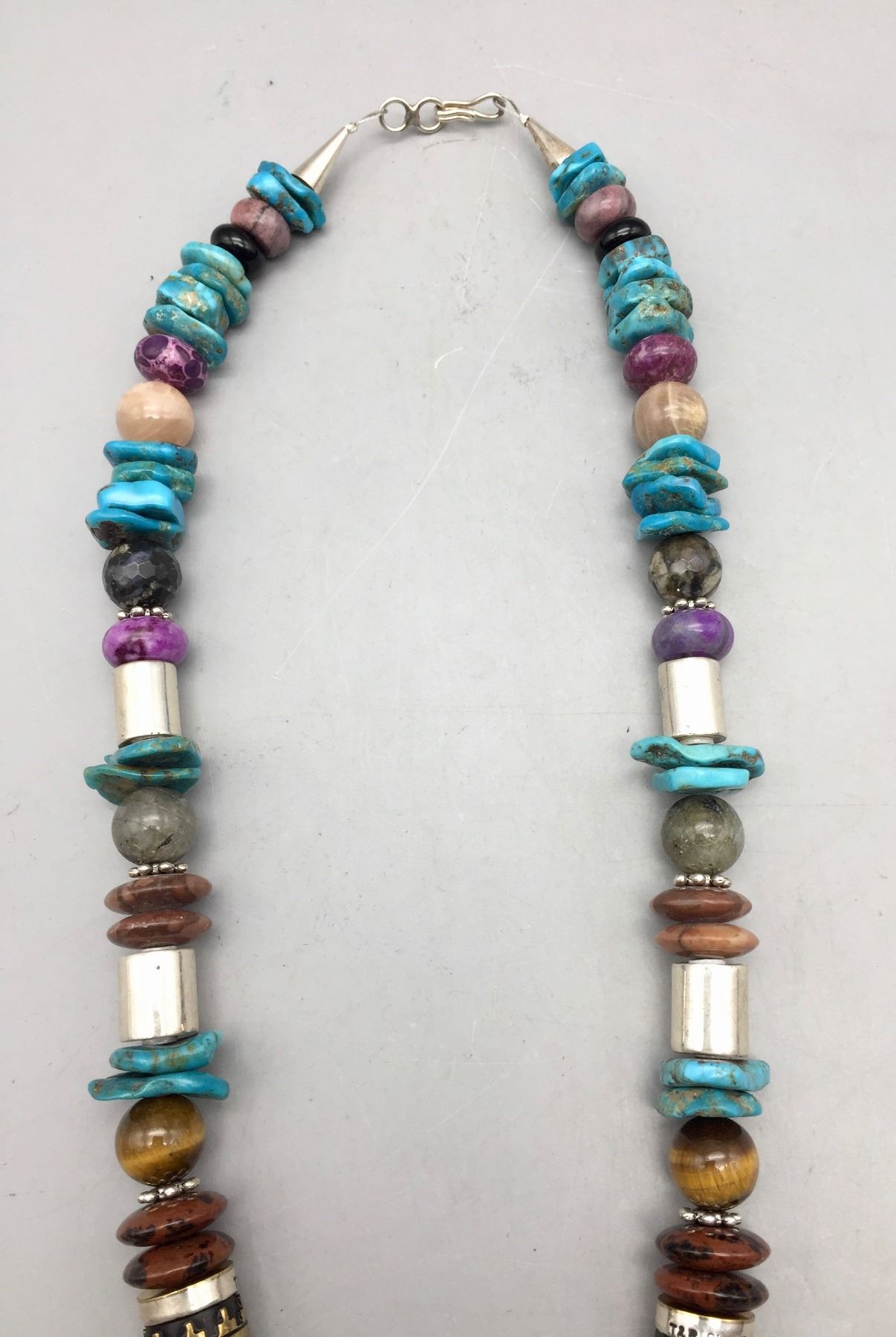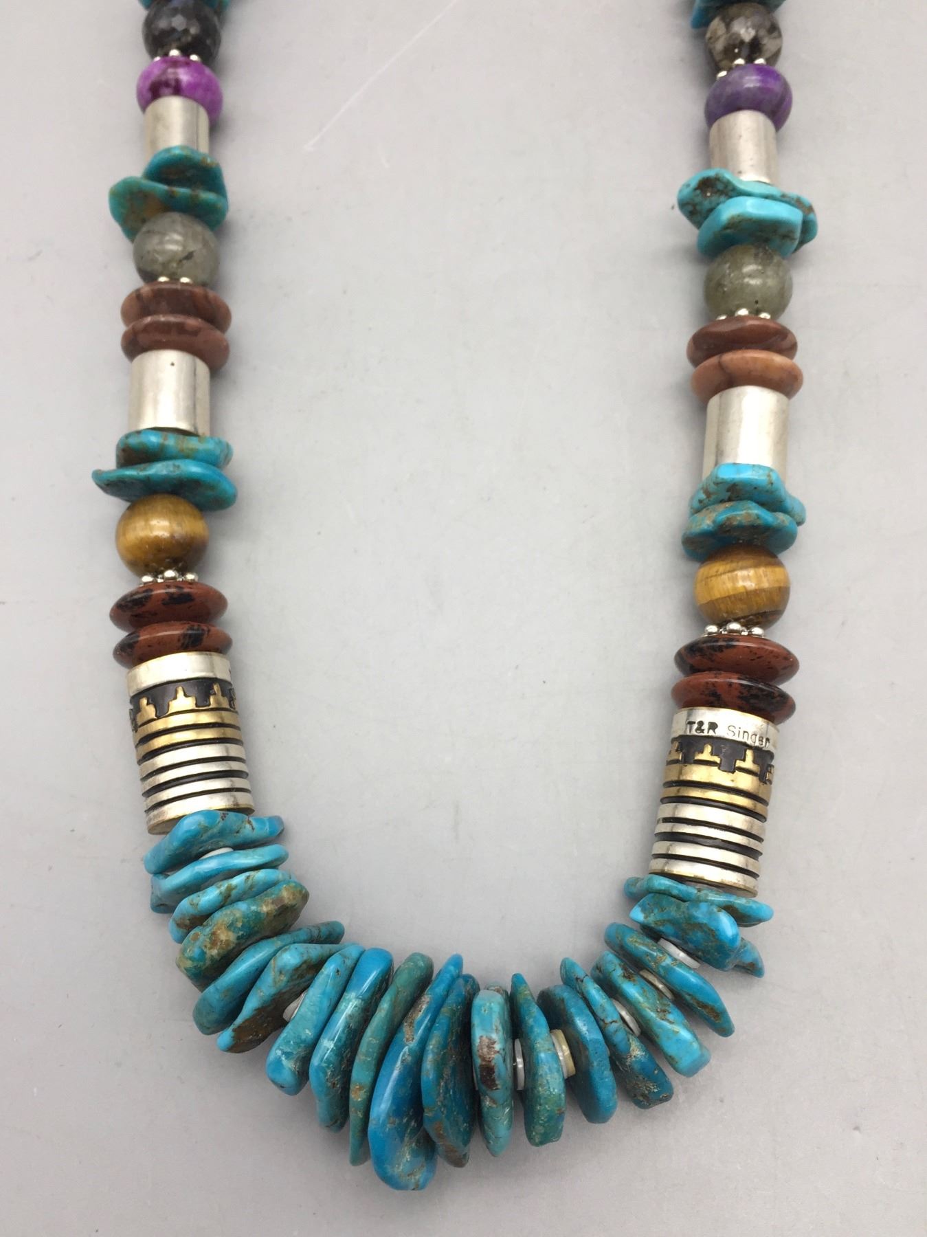 Description: Featured for sale in this lot is a gorgeous necklace done in traditional, Tommy Singer style. It features turquoise, sterling silver, and other various stones with sterling silver findings. Maker: Hallmarked T and R Singer. Tommy and Rita Singer, Navajo. Approx. Age: Fairly modern. Size: Fits a 22-1/4” neck. Weighs 131.1 grams. Condition: Good for its age, normal wear expected. Please look closely at the pictures - they are an important part of our description. Shipping: There will be a $5 handling / packaging fee for shipping this lot. The actual cost of postage will be added on top of that.
