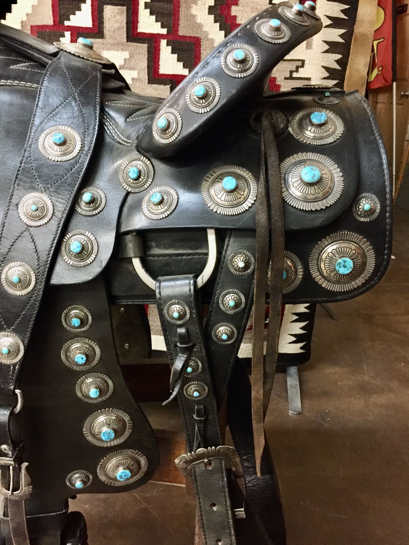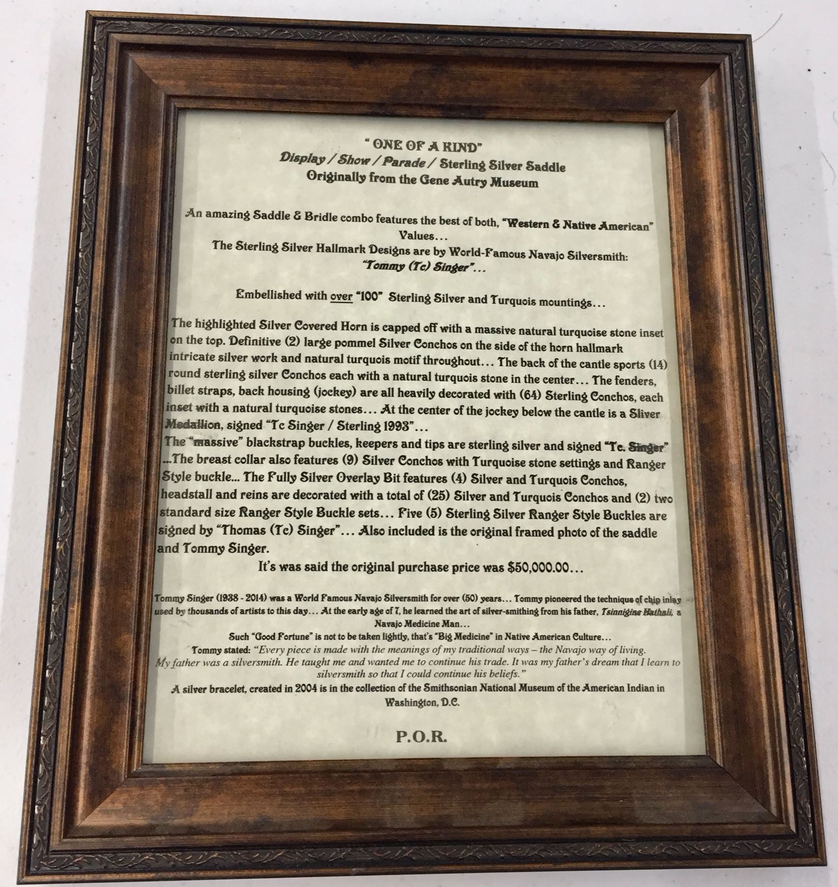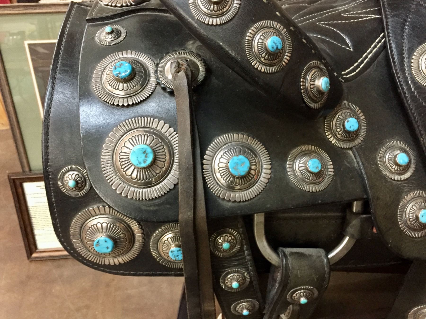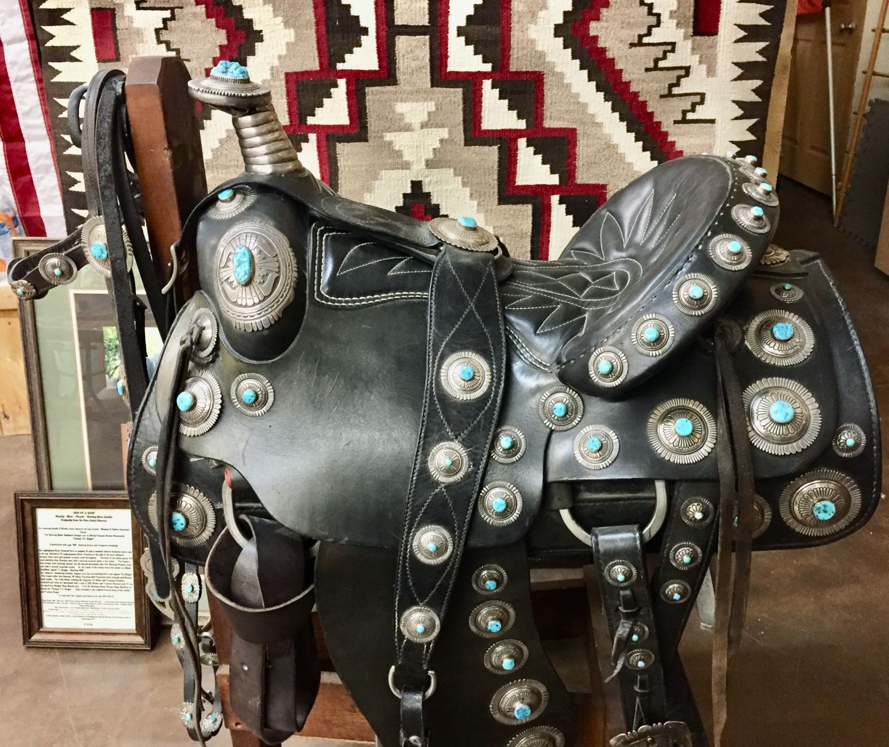 Description: For your pleasure we offer for sale this gorgeous, dark leather saddle with sterling silver conchos that feature nugget style turquoise in the center of each one. The Saddle comes with matching headstall, bit and breast collar along with a framed letter detailing its origins. There is a photo of Tommy Singer and the saddle to display with the masterpiece! According to the paperwork and previous owner, this came out of the Gene Autry Museum in California. Original price on this saddle was reportedly $50,000! James Barton and Brent Joe are also two of the Navajo Silversmiths who have been identified as working on this GREAT saddle! These two men worked for Tommy Singer. There are over 130 PIECES of individually crafted pieces of silver on this set, most of which have turquoise settings!