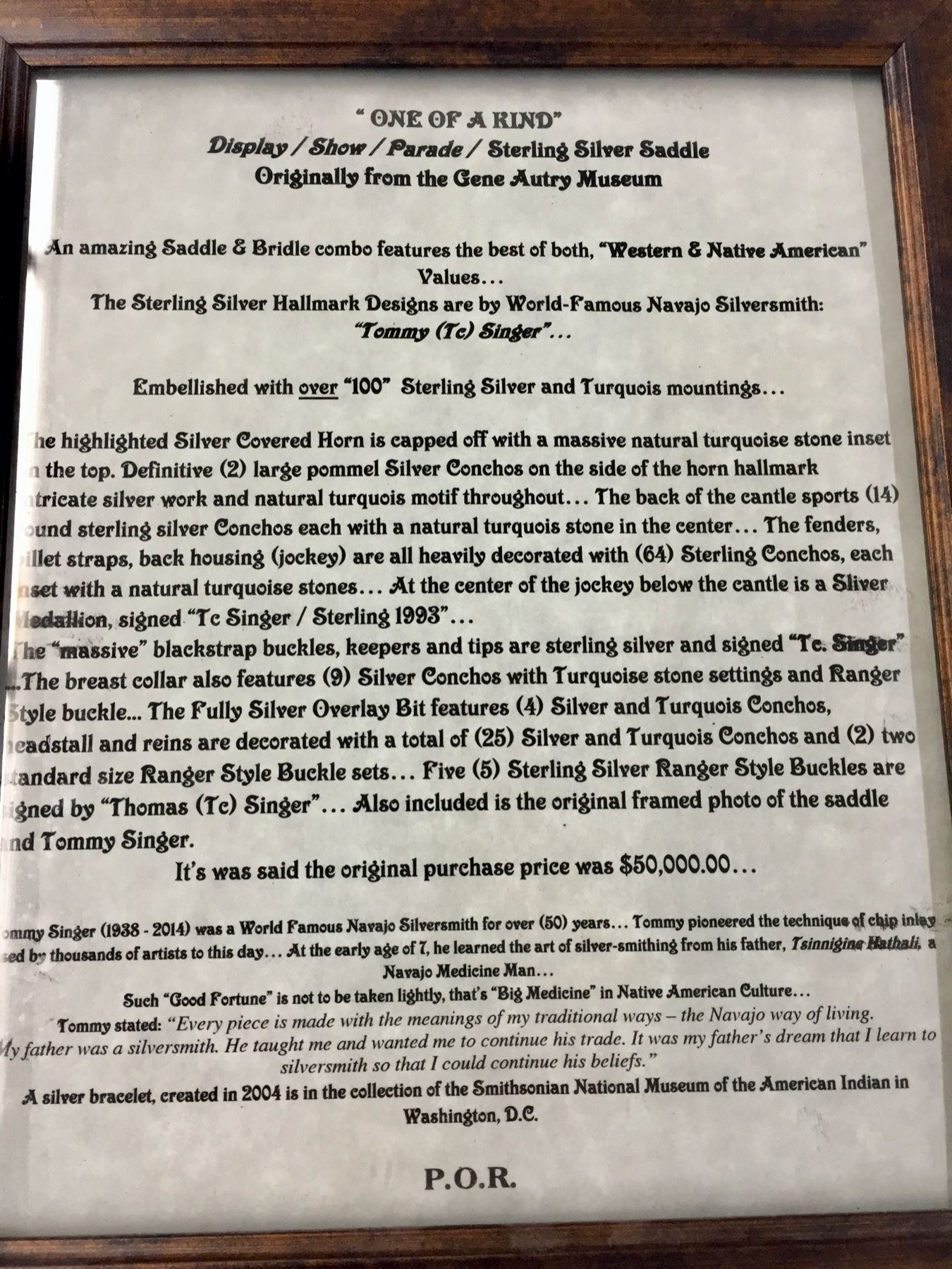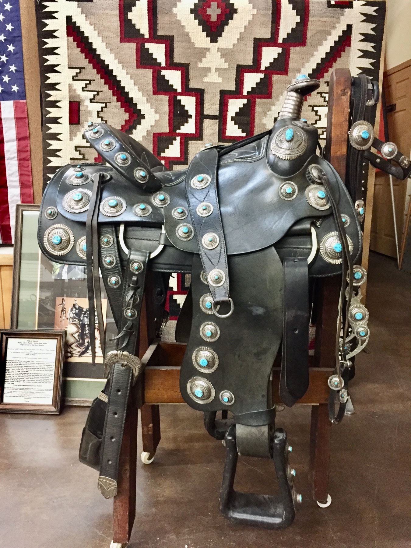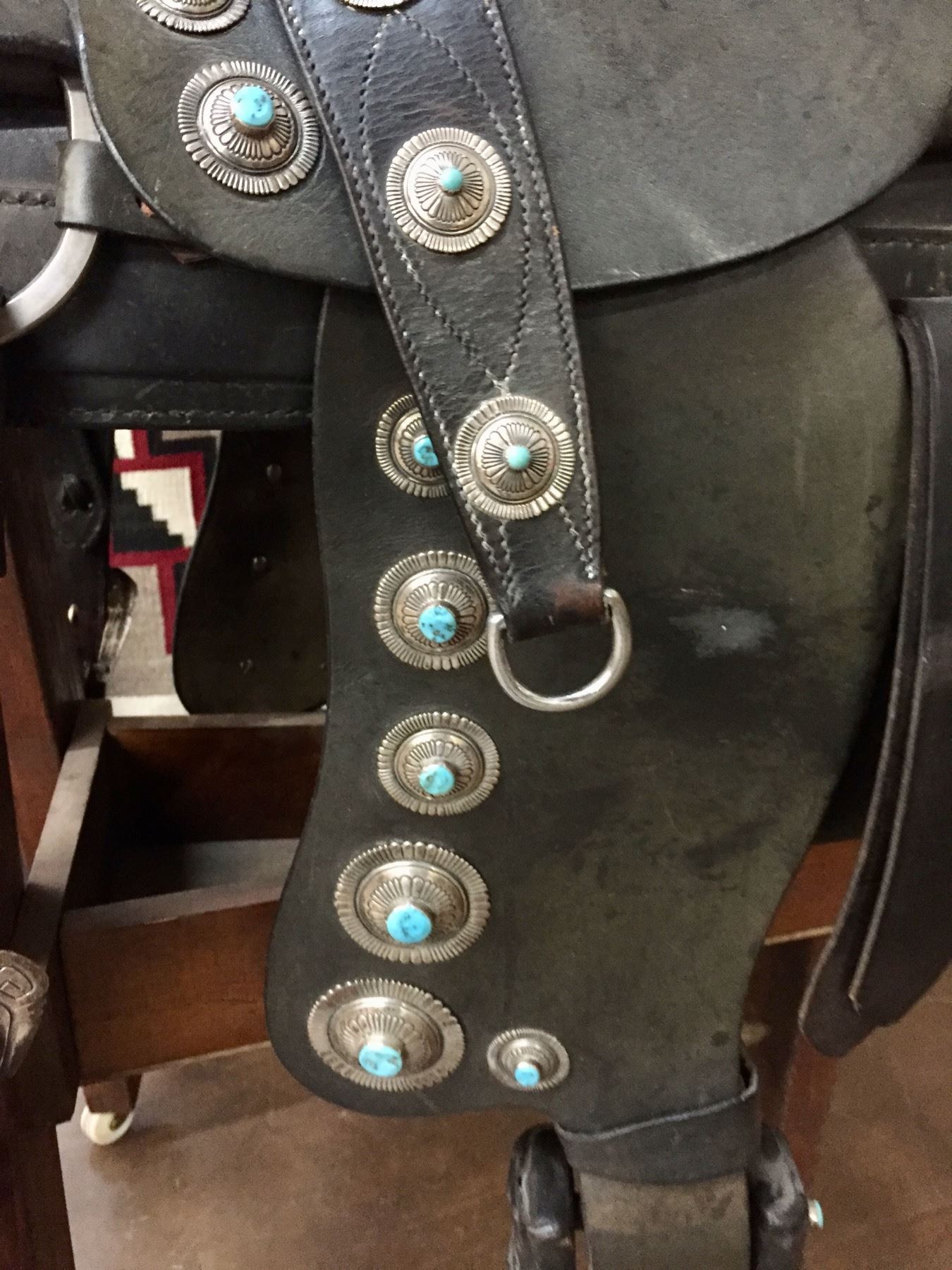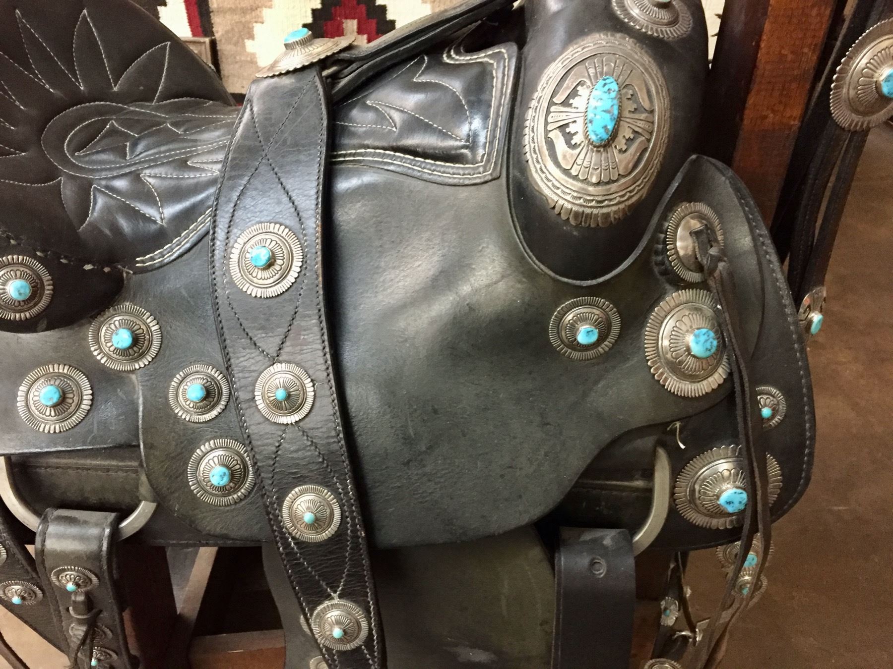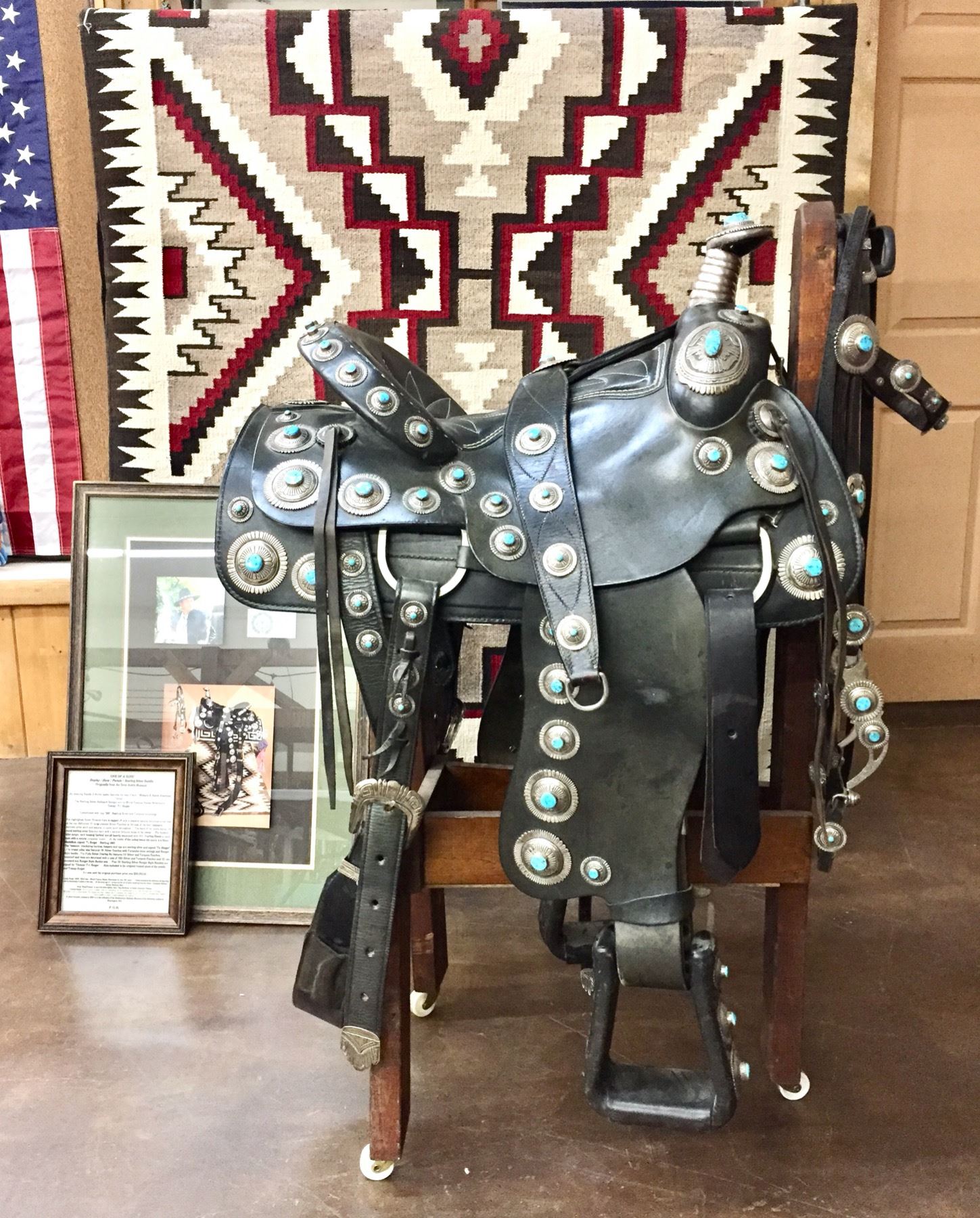 Description: For your pleasure we offer for sale this gorgeous, dark leather saddle with sterling silver conchos that feature nugget style turquoise in the center of each one. The Saddle comes with matching headstall, bit and breast collar along with a framed letter detailing its origins. There is a photo of Tommy Singer and the saddle to display with the masterpiece! According to the paperwork and previous owner, this came out of the Gene Autry Museum in California. Original price on this saddle was reportedly $50,000! James Barton and Brent Joe are also two of the Navajo Silversmiths who have been identified as working on this GREAT saddle! These two men worked for Tommy Singer. There are over 130 PIECES of individually crafted pieces of silver on this set, most of which have turquoise settings!