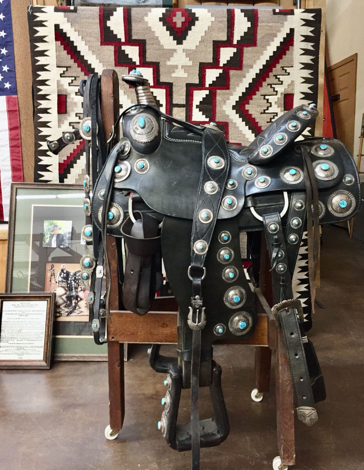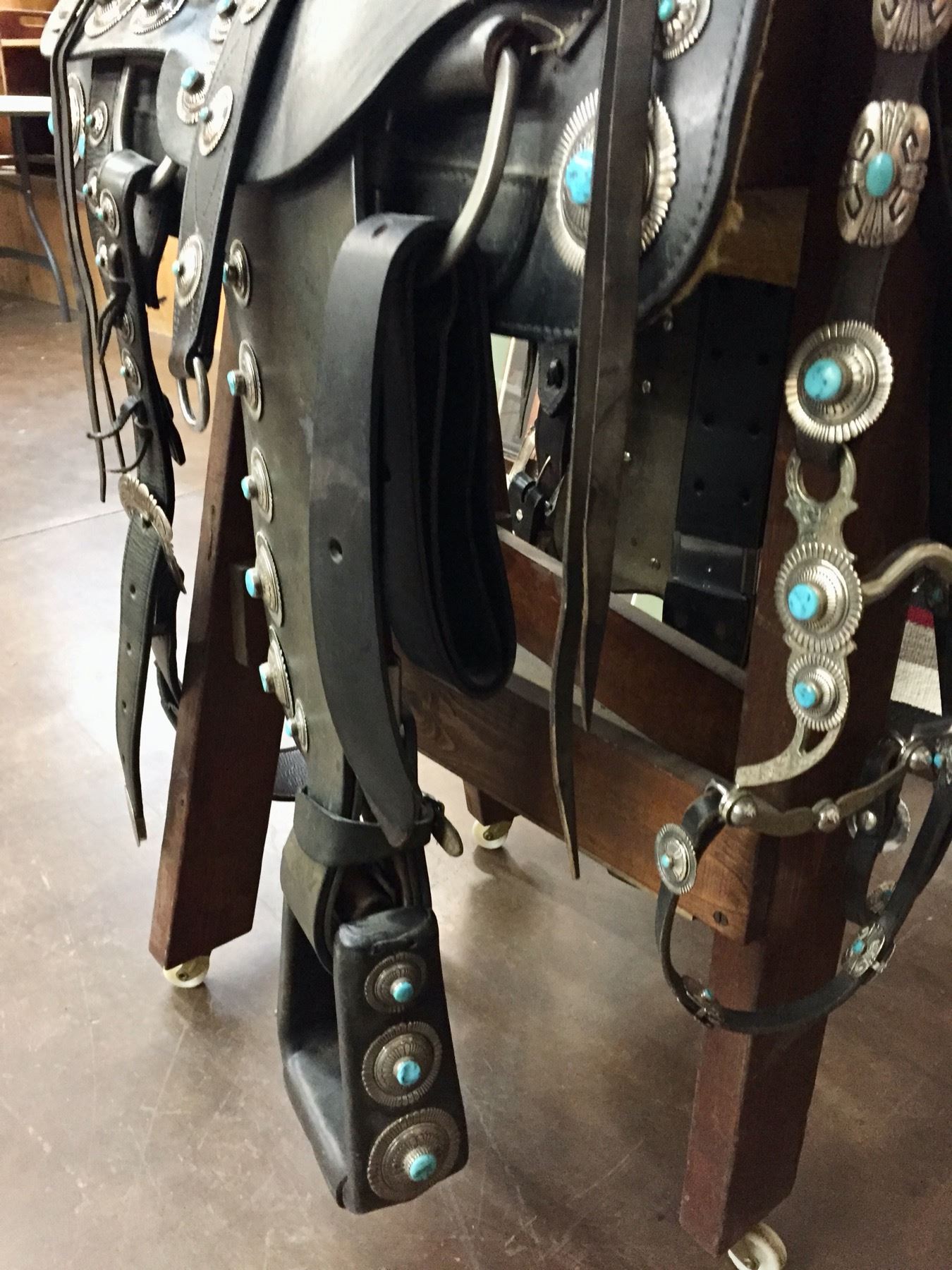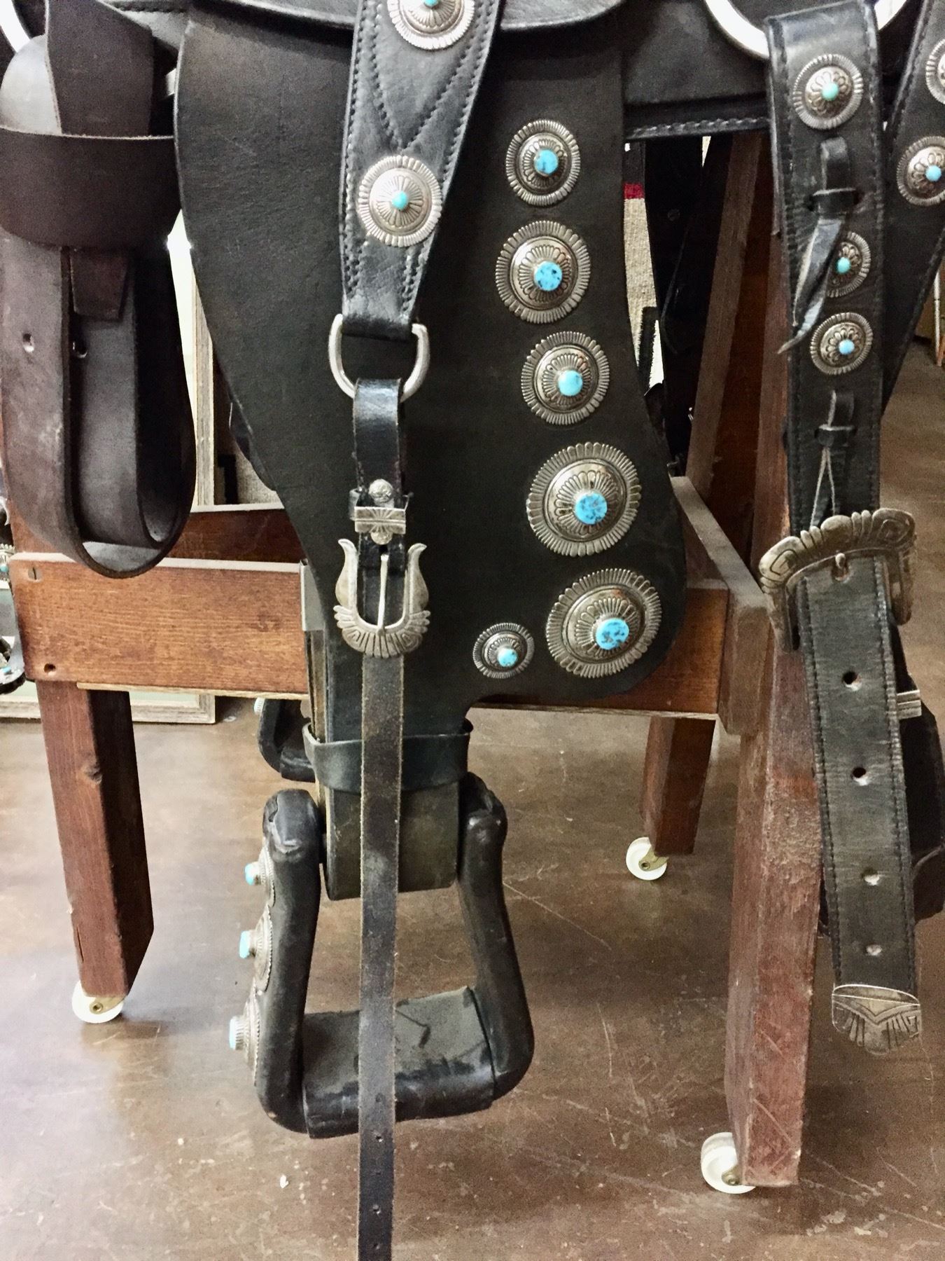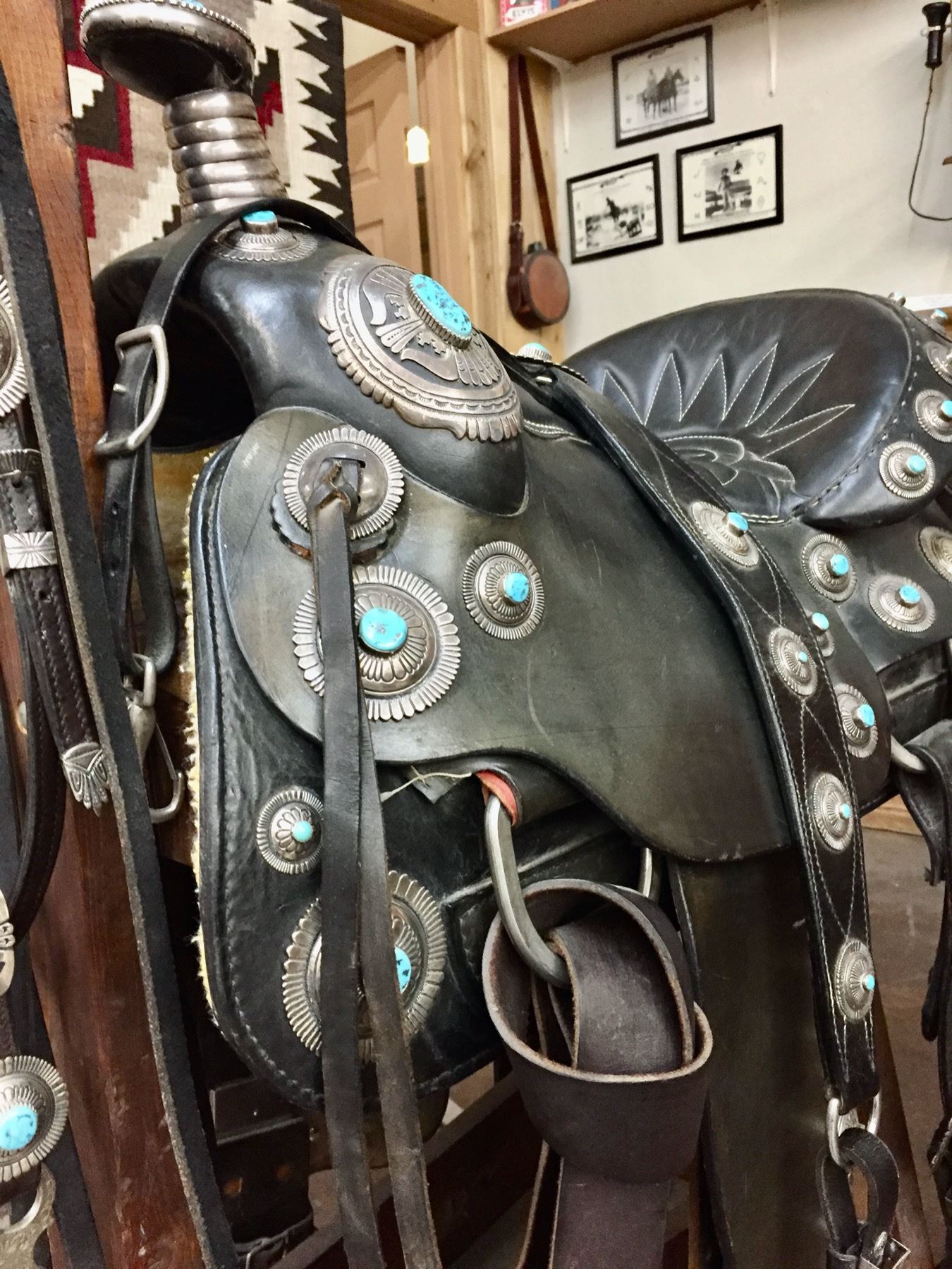 Description: For your pleasure we offer for sale this gorgeous, dark leather saddle with sterling silver conchos that feature nugget style turquoise in the center of each one. The Saddle comes with matching headstall, bit and breast collar along with a framed letter detailing its origins. There is a photo of Tommy Singer and the saddle to display with the masterpiece! According to the paperwork and previous owner, this came out of the Gene Autry Museum in California. Original price on this saddle was reportedly $50,000! James Barton and Brent Joe are also two of the Navajo Silversmiths who have been identified as working on this GREAT saddle! These two men worked for Tommy Singer. There are over 130 PIECES of individually crafted pieces of silver on this set, most of which have turquoise settings!
