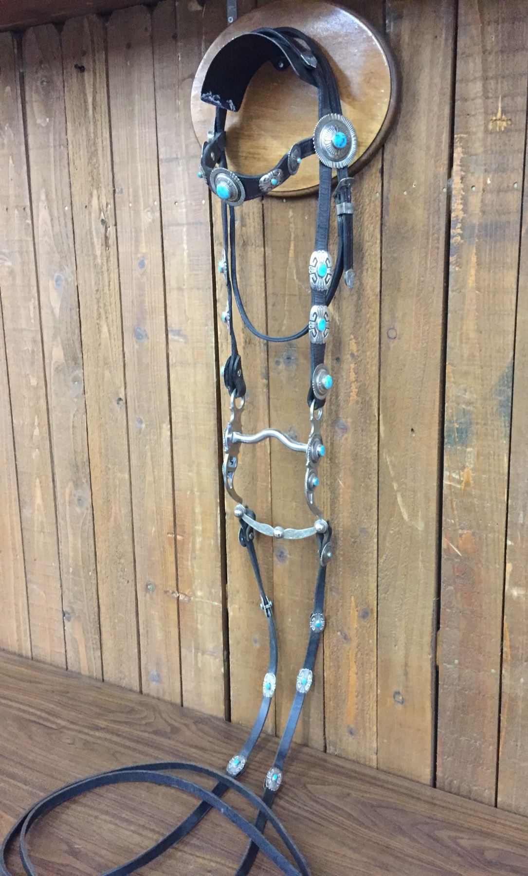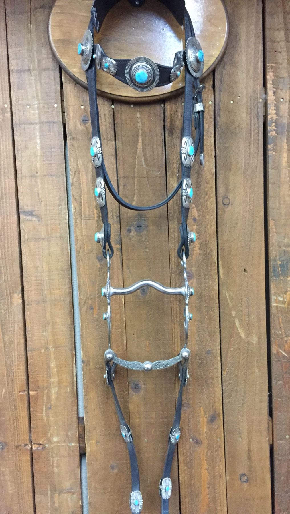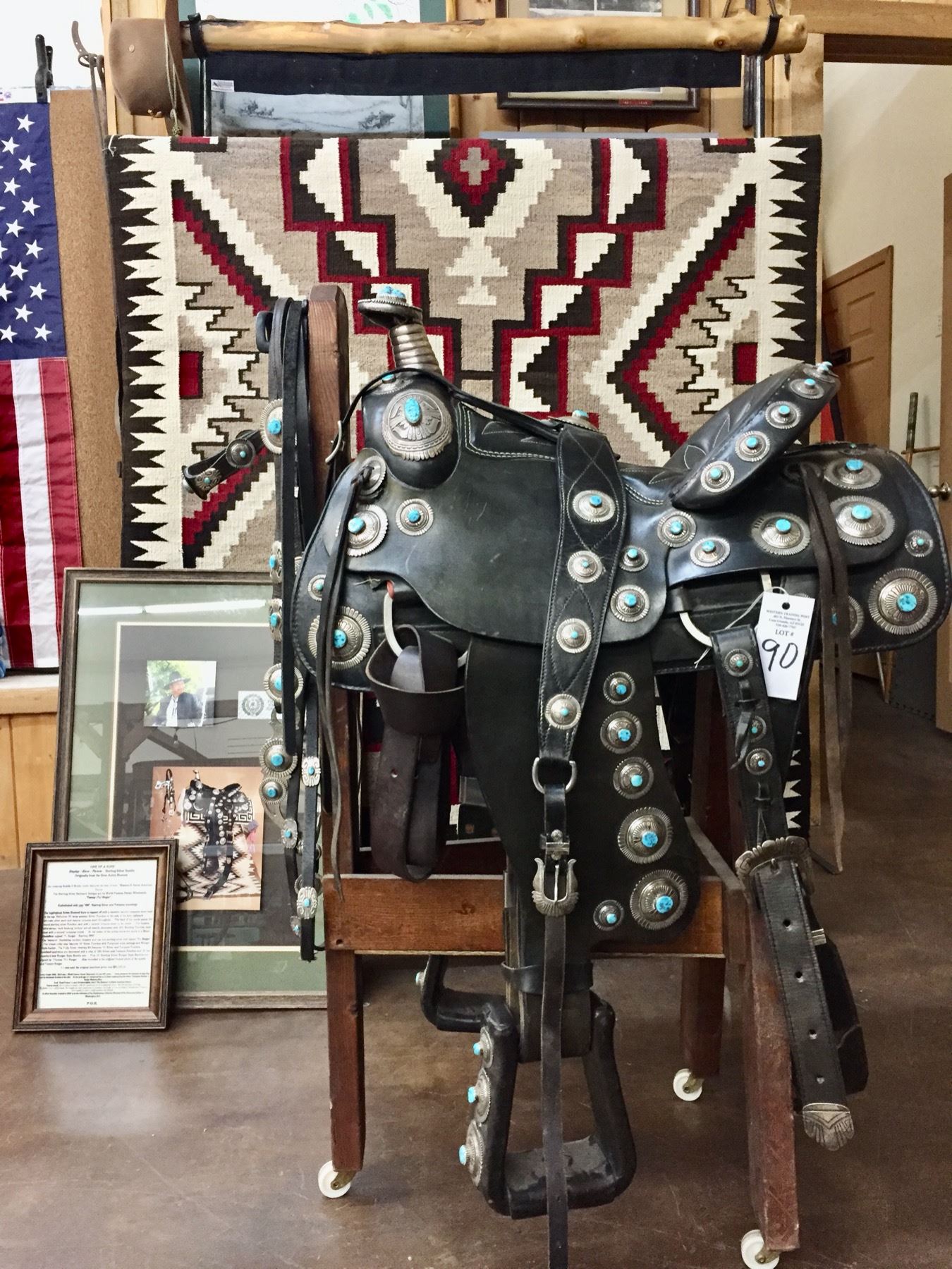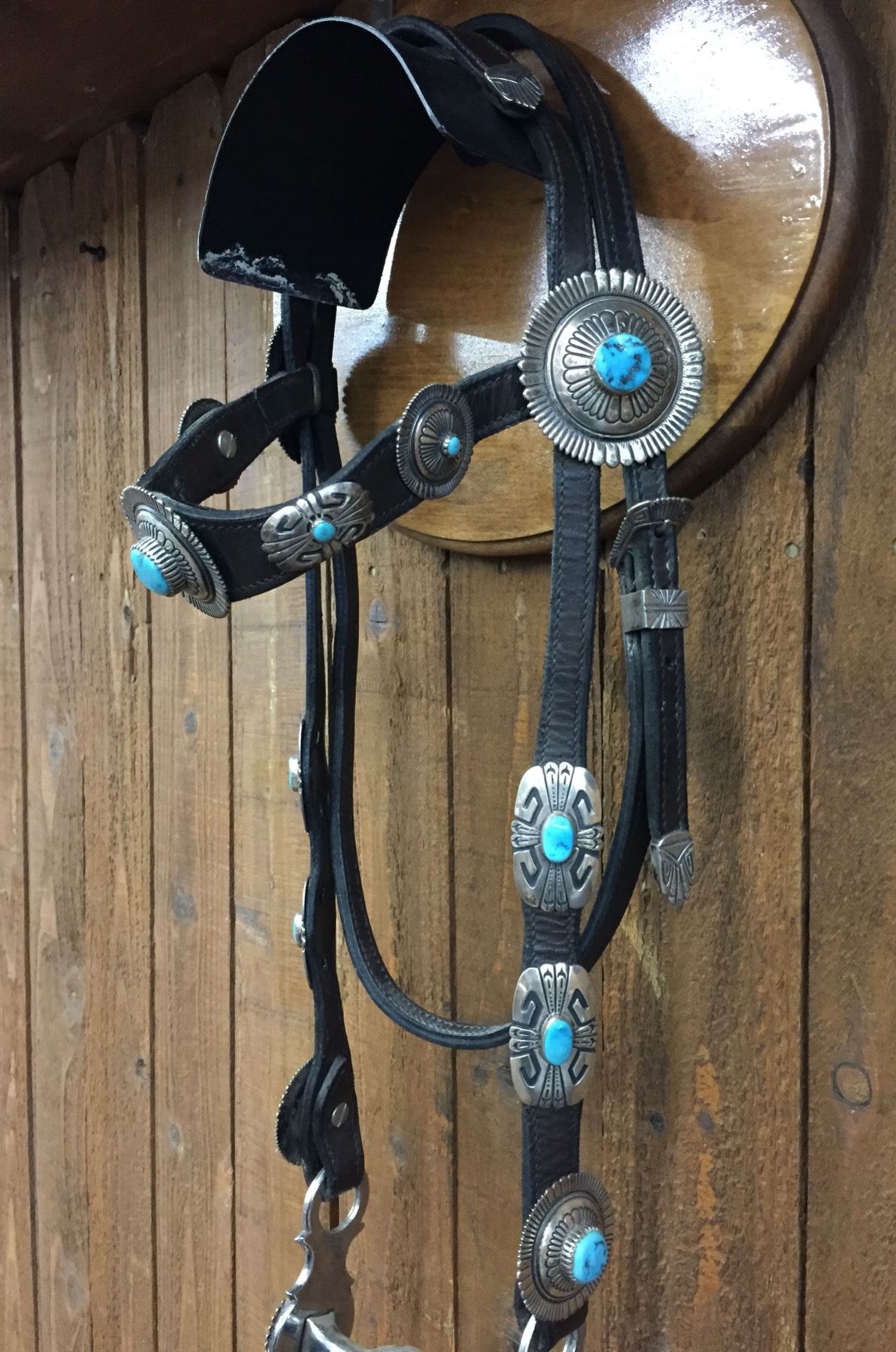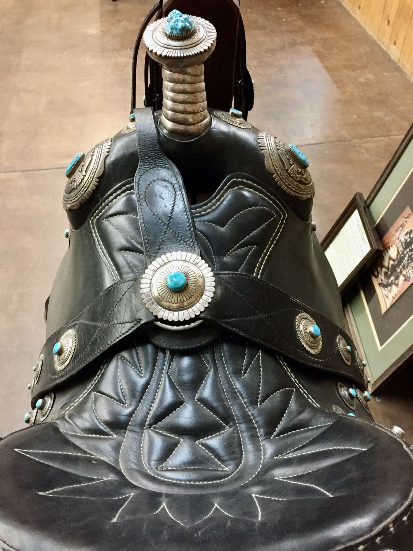 Description: For your pleasure we offer for sale this gorgeous, dark leather saddle with sterling silver conchos that feature nugget style turquoise in the center of each one. The Saddle comes with matching headstall, bit and breast collar along with a framed letter detailing its origins. There is a photo of Tommy Singer and the saddle to display with the masterpiece! According to the paperwork and previous owner, this came out of the Gene Autry Museum in California. Original price on this saddle was reportedly $50,000! James Barton and Brent Joe are also two of the Navajo Silversmiths who have been identified as working on this GREAT saddle! These two men worked for Tommy Singer. There are over 130 PIECES of individually crafted pieces of silver on this set, most of which have turquoise settings!