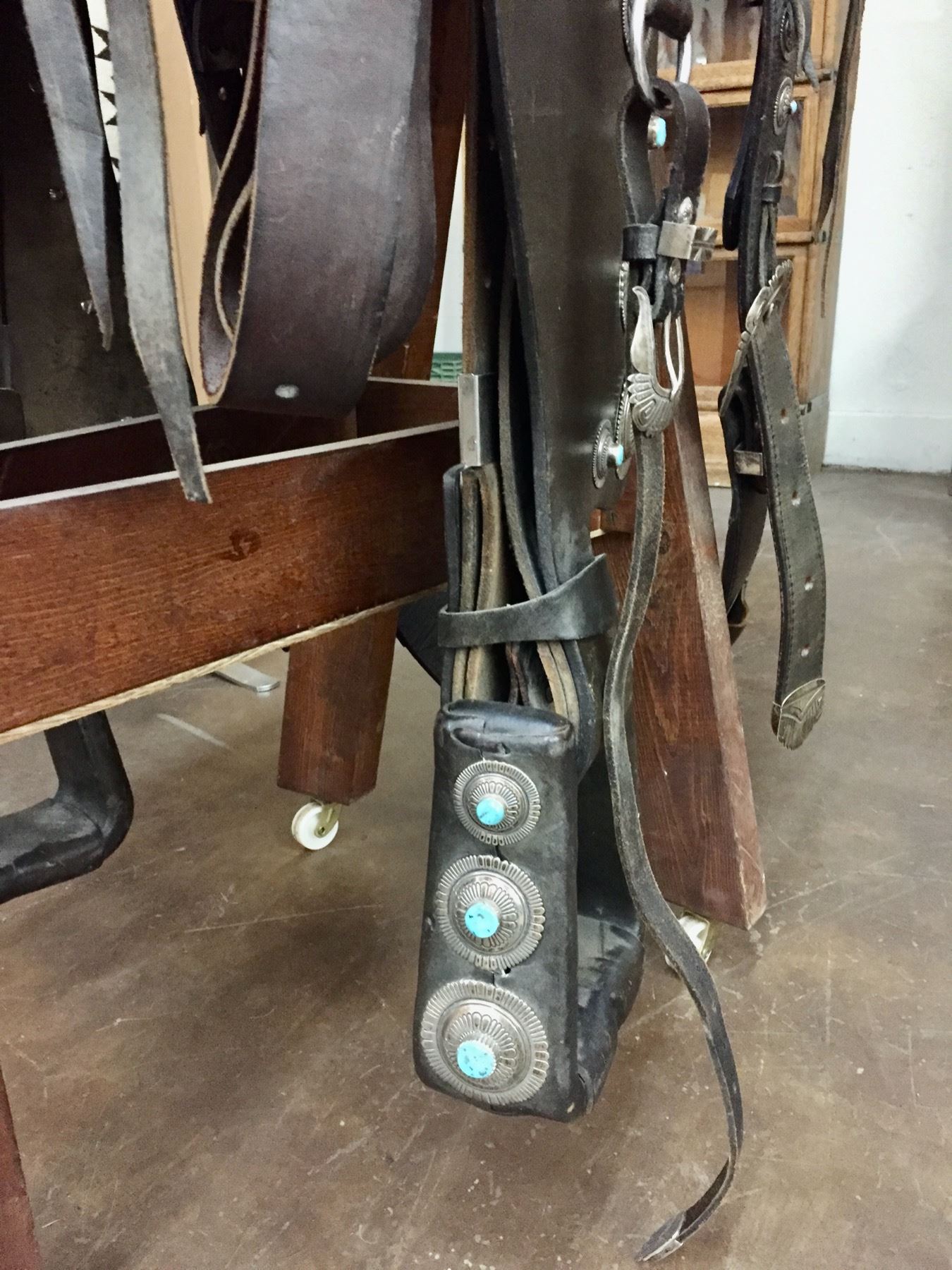 Size: Saddle has a 15” seat. Art measures 21-1/2”w x 31” long. Condition: Good for their ages, minimal wear expected. Please note, one of the breast collar straps that hooks back to the D-ring is missing.