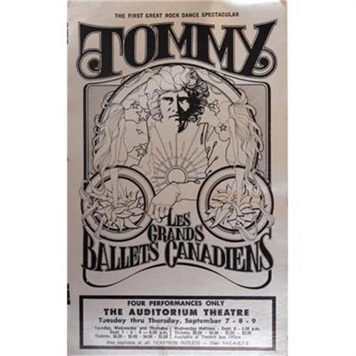 MJP1739 ? Tommy / The Who- 13-1/2" x 22", stunning black on silver poster for the rock opera Tommy, to be performed at the Auditorium Theatre (Chicago) by Les Grands Ballets Canadiens. Some wrinkling, edge tear, bumped corners. Good/Fair condition.