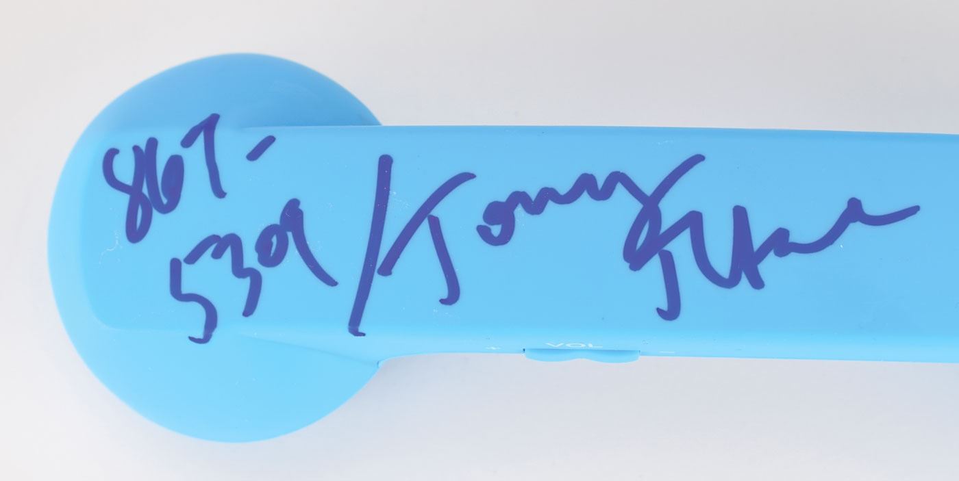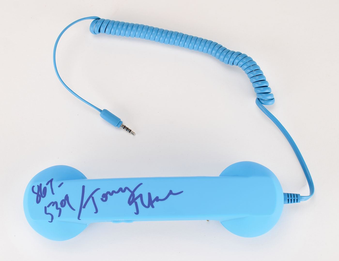 Blue telephone handset with cord, signed on the top in blue felt tip by lead singer Tommy Heath, who signs as "Tommy Tutone" and adds "867-5309." In fine condition.