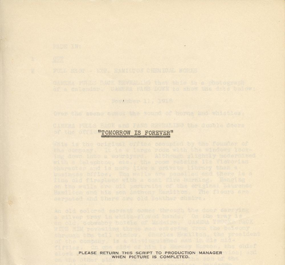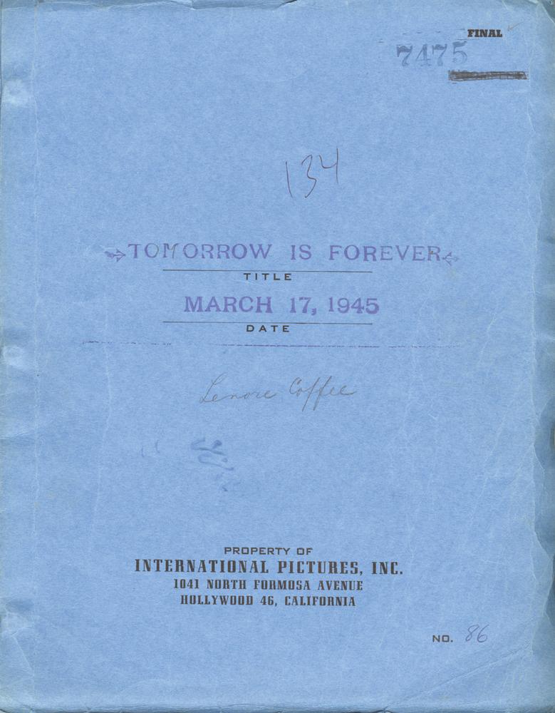 (RKO, 1946) Complete 134pp Final shooting script, dated March 17, 1945 (blue revision pages dated March 21), for Tomorrow Is Forever starring Orson Welles, Claudette Colbert and Natalie Wood. Original light blue studio covers with screenwriter Lenore Coffee’s pencil signature on the front cover. Covers show minor wear.