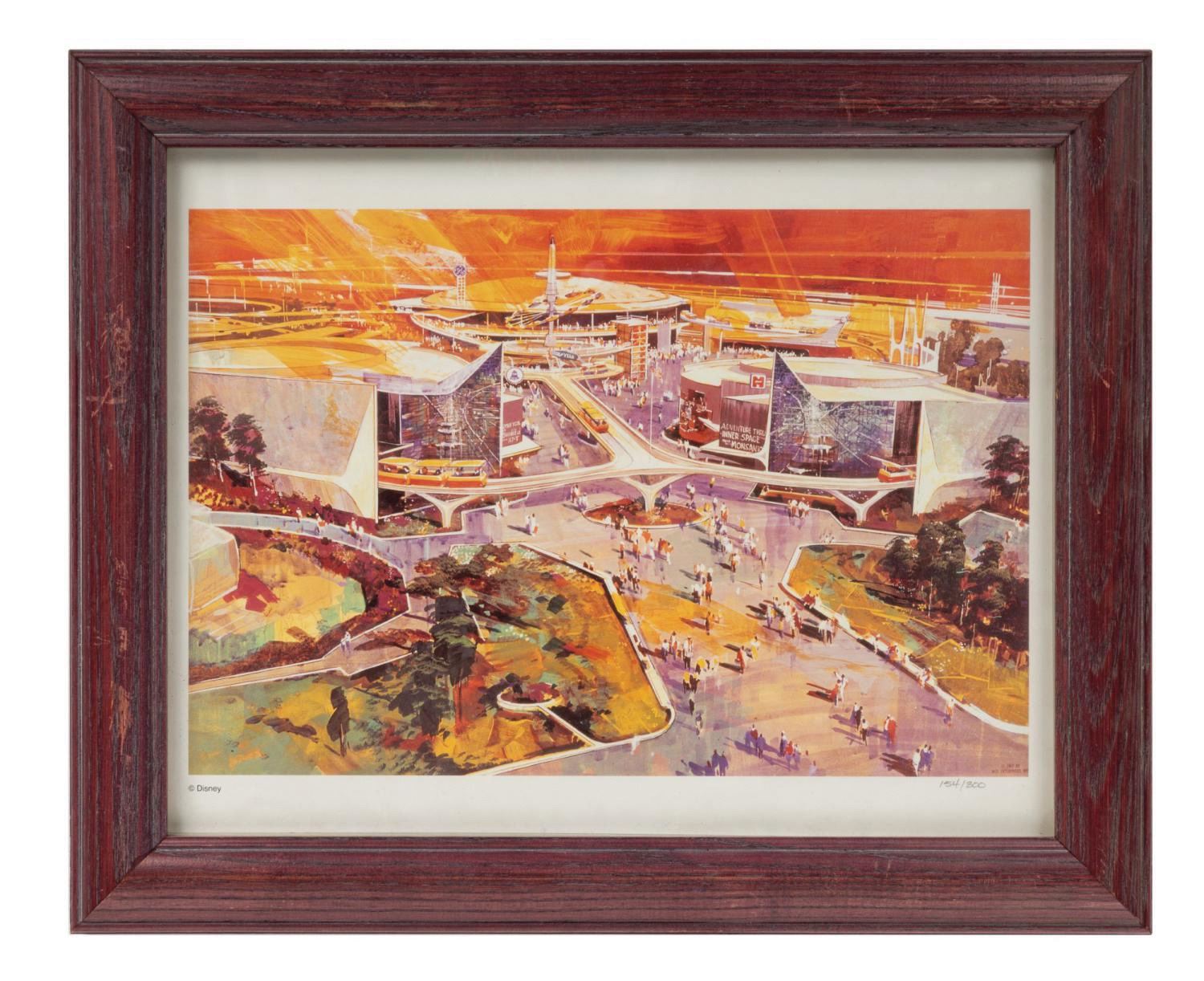(Disneyland, 1997) A lithographic print titled "Tomorrowland 1967" by Herb Ryman. It was released in coordination with the 10th anniversary of The Disney Gallery in 1997, which also marked the 30th anniversary of the 1967 Tomorrowland expansion. The dynamic imagery depicts the broad entryway and Tomorrowland Mall, flanked by exhibit halls with reflective murals, and elevated PeopleMover rails with trains leading the way toward rotating Rocket Jets and the General Electric Carousel of Progress. With 10.5"x13.5" viewable in a 13.5"x16" wooden frame, the print is hand-numbered "154/300" and is in fine condition. The original COA is included.