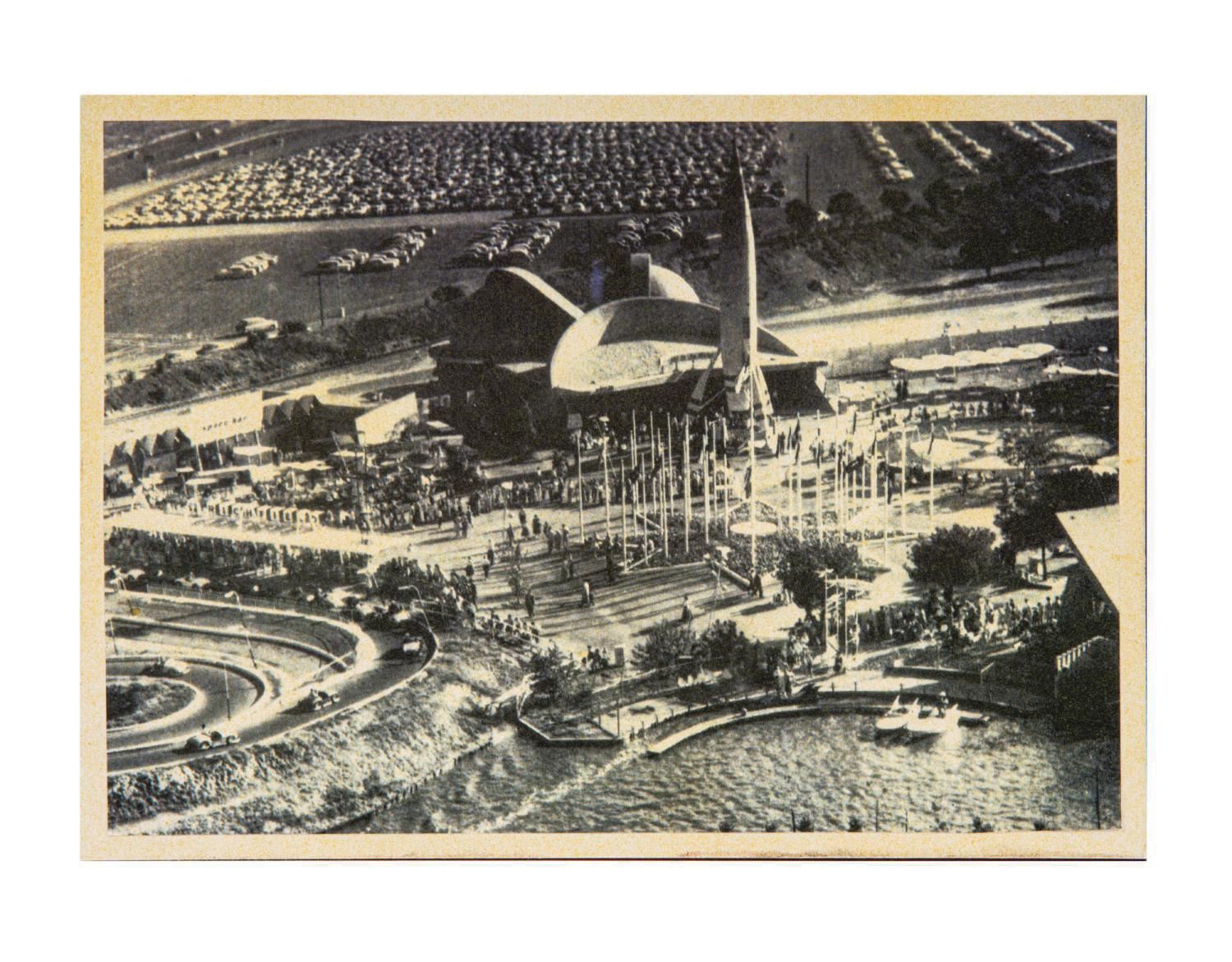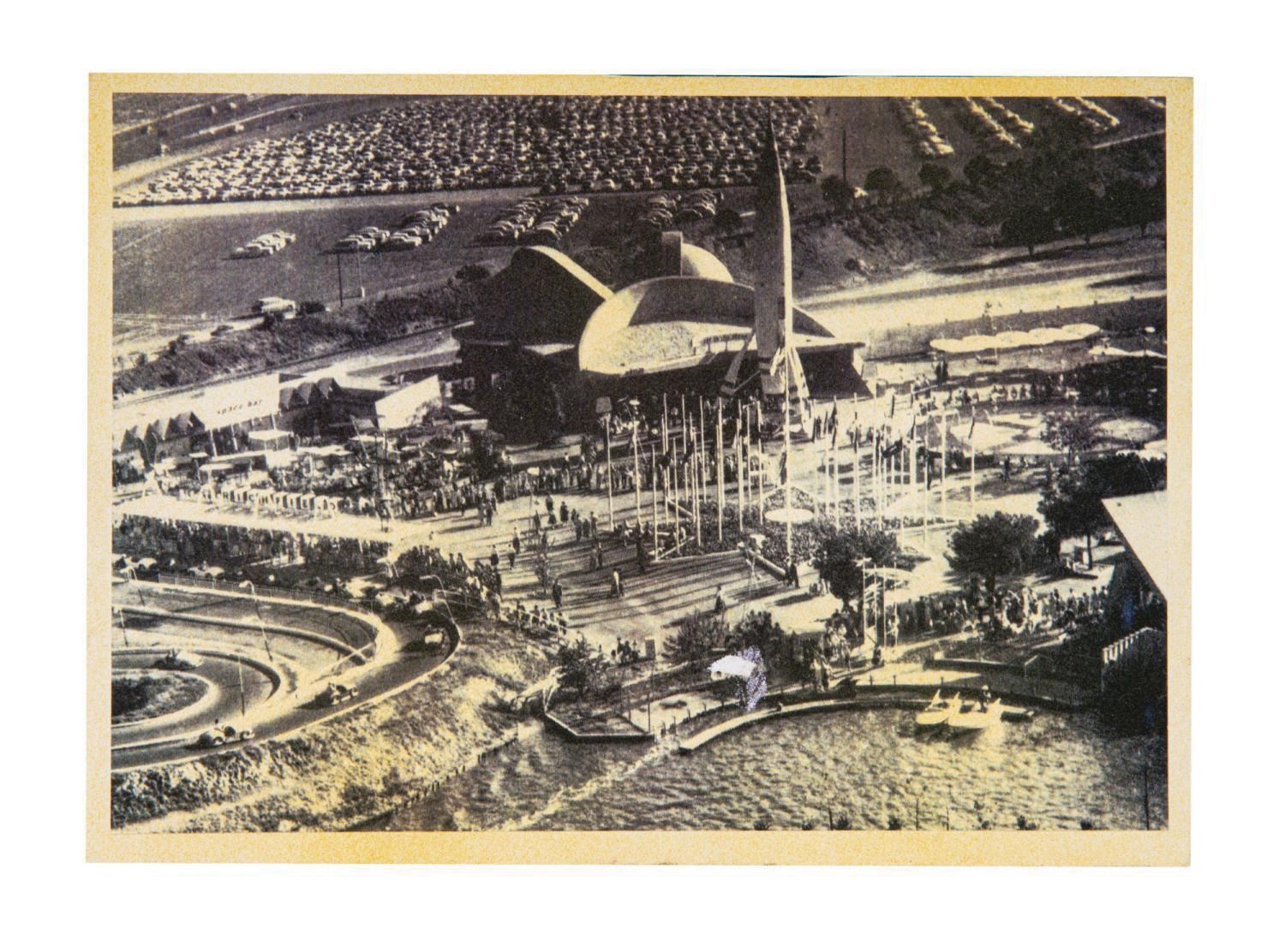 (Disneyland, c.1980s) A double-sided photo print of Tomorrowland as seen during Disneyland's earliest years. The piece is composed of two matching vintage photos applied to two sheets of board, and was likely used in a display to reference key moments of the Park's history. The photo shows the Phantom Boats, Court of Honors, and the TWA Rocket Pylon before a backdrop of the original Parking Lot Area A. Measuring 10"x7.25", the photo display is in good condition with some surface wear and discoloration.