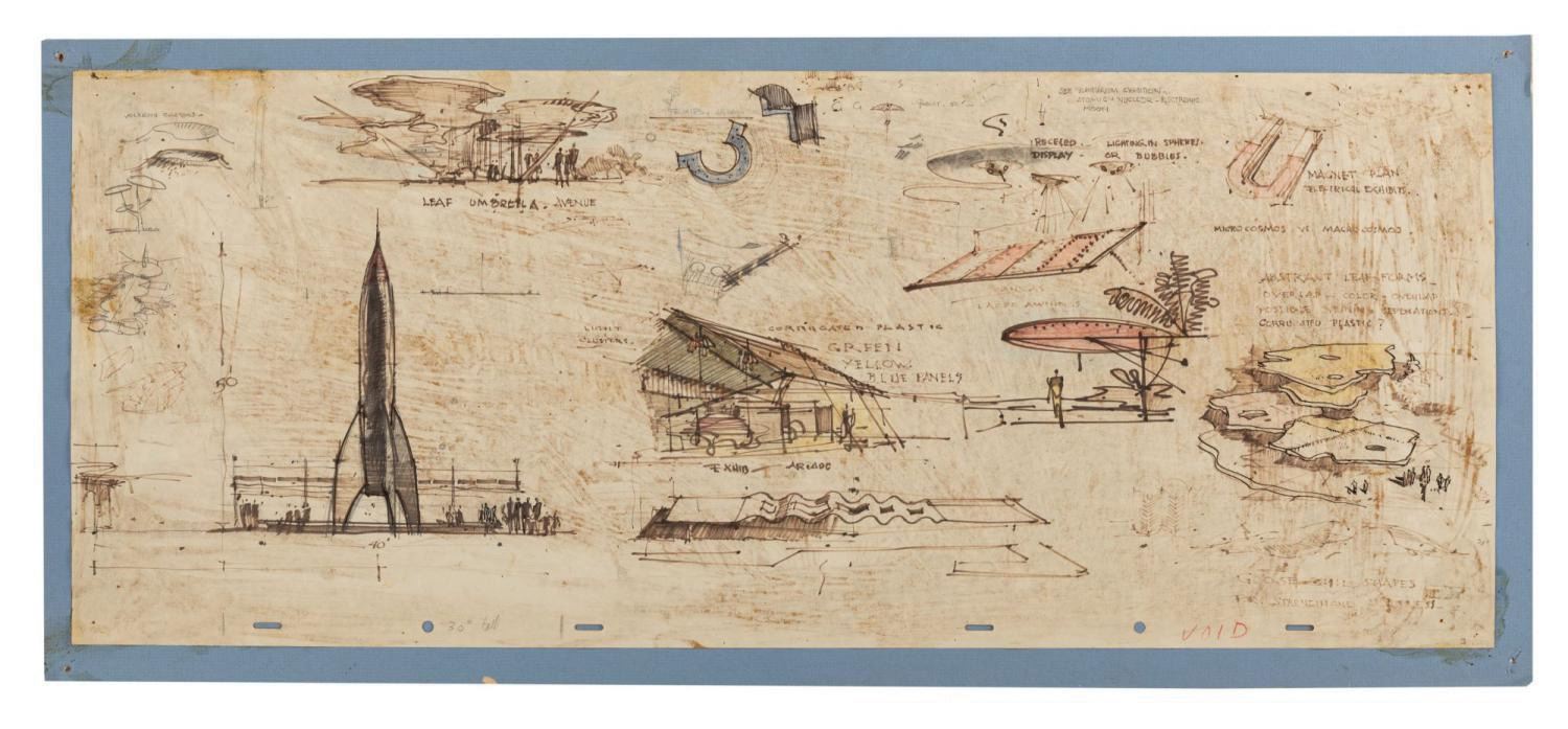 (Disneyland, c.1954) A large sheet of Tomorrowland show element concepts created by Imagineer Herb Ryman. Throughout this sheet of original drawings, Ryman developed ideas for Tomorrowland including a magnet section of an electrical exhibit, a planetarium exhibition, a "micro cosmos vs. macro cosmos" exhibit, and of particular note, the large 50ft Tomorrowland Rocket. While some of the concepts were marked "void" as for their installation, it was Ryman's drawings like these that not only helped shape what Tomorrowland would become, but helped in the development of Disneyland as a whole. Measuring 31"x12.5", the drawing is mounted to artist's board and displays in good condition. There are creases and wear throughout from use, and some color toning and discoloration.