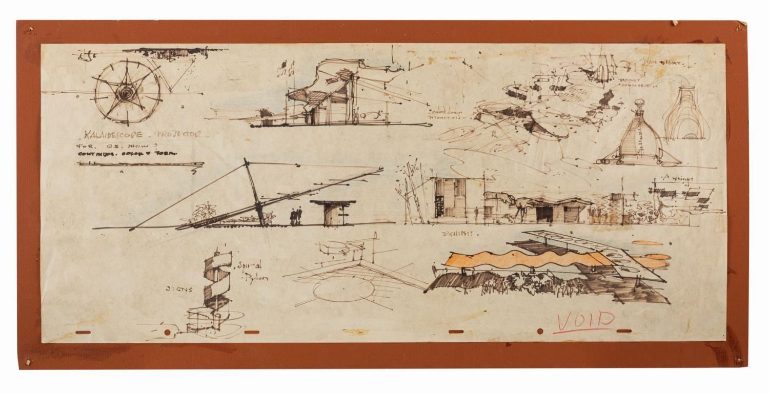 (Disneyland, 1954) An original concept drawing of Tomorrowland elements created by Herbert Ryman. The concepts on this page marked void include a Kaleidoscope Projector for a potential G.E. Show, a spiral pylon, ribbed awnings for the Rocket Space Port, and details mentioning a"scaled-down monorail" five years before the Disneyland-ALWEG Monorail debuted at the Park. Accomplished in mixed media, measuring 12.5" x 28.5" and mounted to matte board measuring 14.5" x 30.5", the drawing displays in good condition with edge wear, light warping, discoloration from age and adhesive bleed through, edge wear and adhesive stains to the matte, and pin holes from production use.