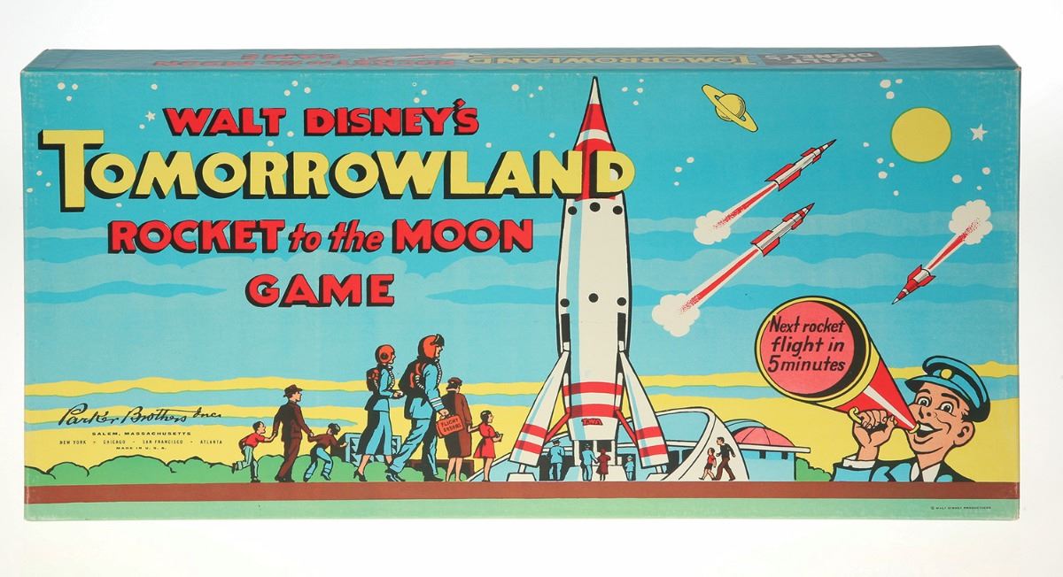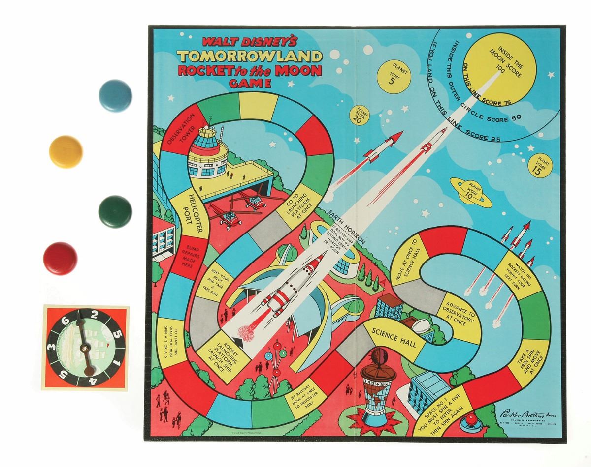 (Parker Bros., 1959) Tomorrowland "Rocket to the Moon" board game by Parker Bros. Box measures 8"x16"x2". Very Fine condition with ball-point pen mark on the underside of the box bottom.