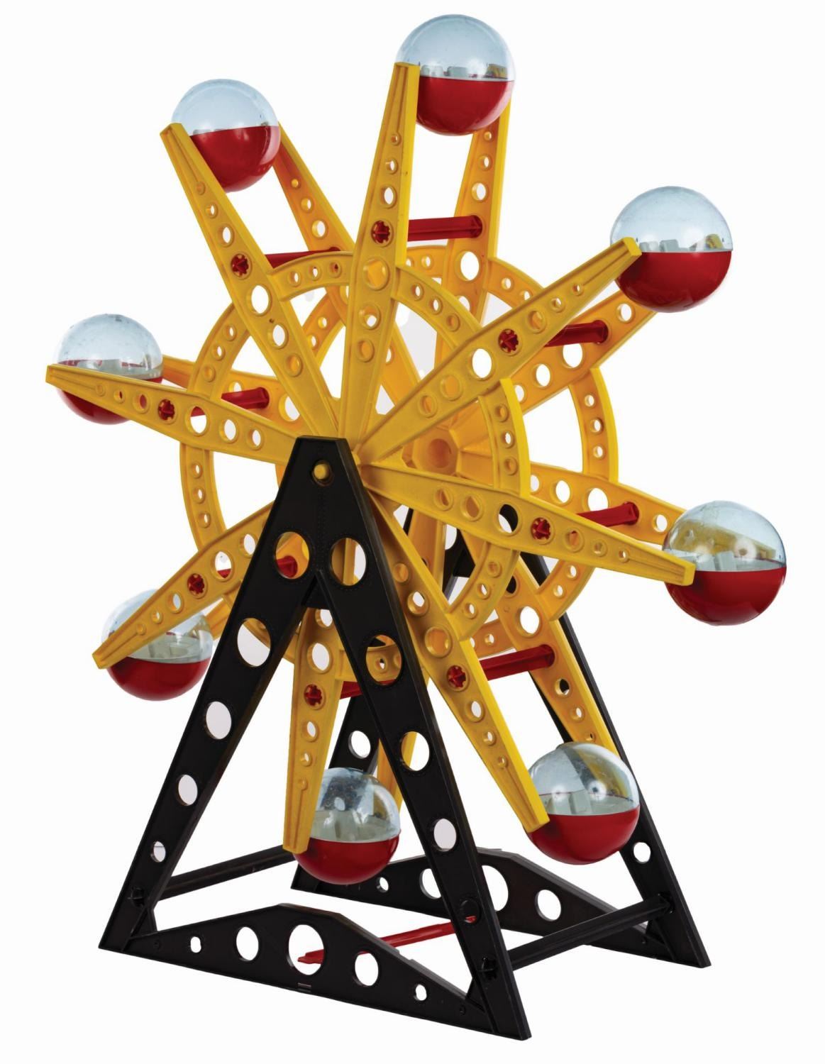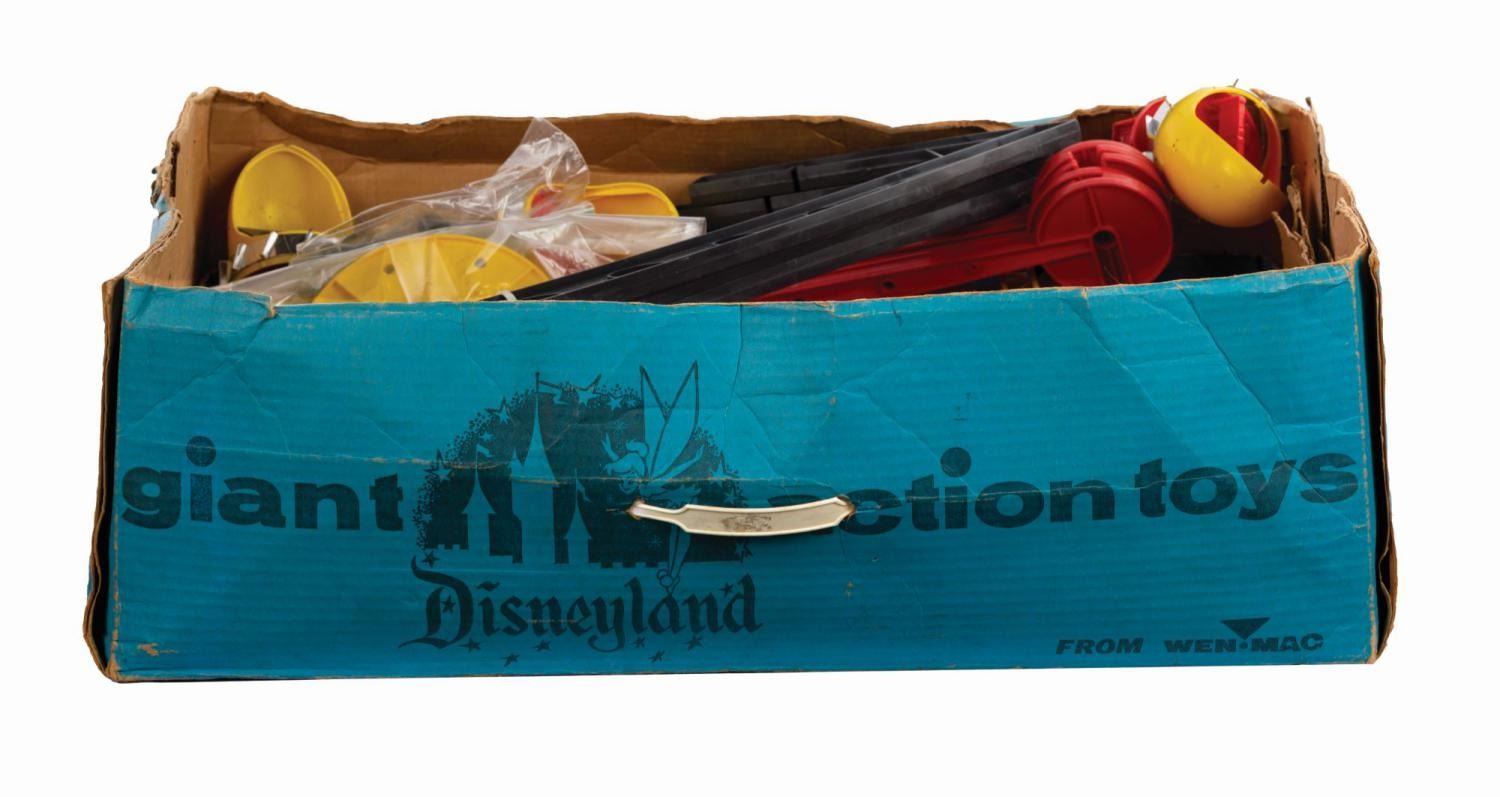 (Disneyland, c.1955) A Tomorrowland Space Carnival by WEN MAC. The Tomorrowland Space Carnival set comes with the parts to assemble the Moon Orbit, Space Wheel, and Rocket Ride "that will delight youngsters everywhere." Assembly is required. Included are the vital drive shafts, pulley, tripod lock top, and suspension arm retainer. The Control Console and Motor are also included but nonfunctioning, and the pins of some "satellite vehicles" are missing. Toys come contained in the bottom portion of good condition "Disneyland Giant Action Toys from WEN MAC" box. Measuring 24"x24" and 7.5" deep, the box (sans lid) exhibits some creasing, wear, and discoloration.