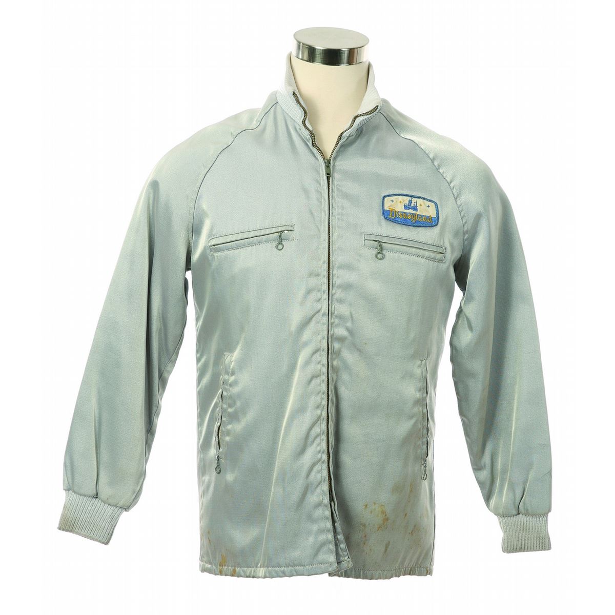 (Disneyland,1975) Early Space Mountain cast-member silver outer jacket worn in the mid 1970s and 1980s. Men's medium, in very good condition with moderate wear with large stains on front of jacket and right sleeve. Some staining on Disneyland patch.