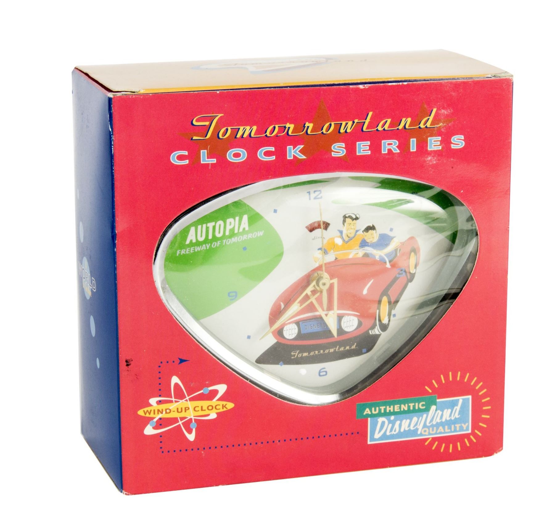 (Disneyland, 1990s) A Tomorrowland wind-up clock featuring imagery from the iconic "Autopia" poster designed by Bjorn Aronson. This item measures 3.25"x6.75" and 6.5" tall in its original box and packaging, and is in fine condition with some wear to the box.