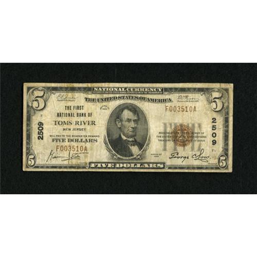 <B>Toms River, NJ</B></I> - $5 1929 Ty. 1 <B>The First NB</B></I> Ch. # 2509<BR> The facsimile signatures of William J. Gruler and George C. Low are seen on this note from an increasingly popular state. <B>Very Good+.</B></I><BR><BR><b>Shipping:</b> Coins & Currency (<a target="_blank" href="http://www.heritageauctions.com/common/shipping.php">view shipping information</a>)
