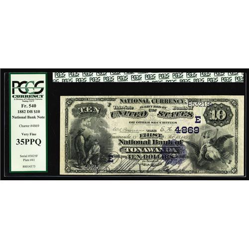 <B>Tonawanda, NY</B></I> - $10 1882 Date Back Fr. 540 <B>The First NB</B></I> Ch. # (E)4869<BR>This $10 is bright with nice color and bold signatures. <B>PCGS Very Fine 35PPQ.</B></I>
