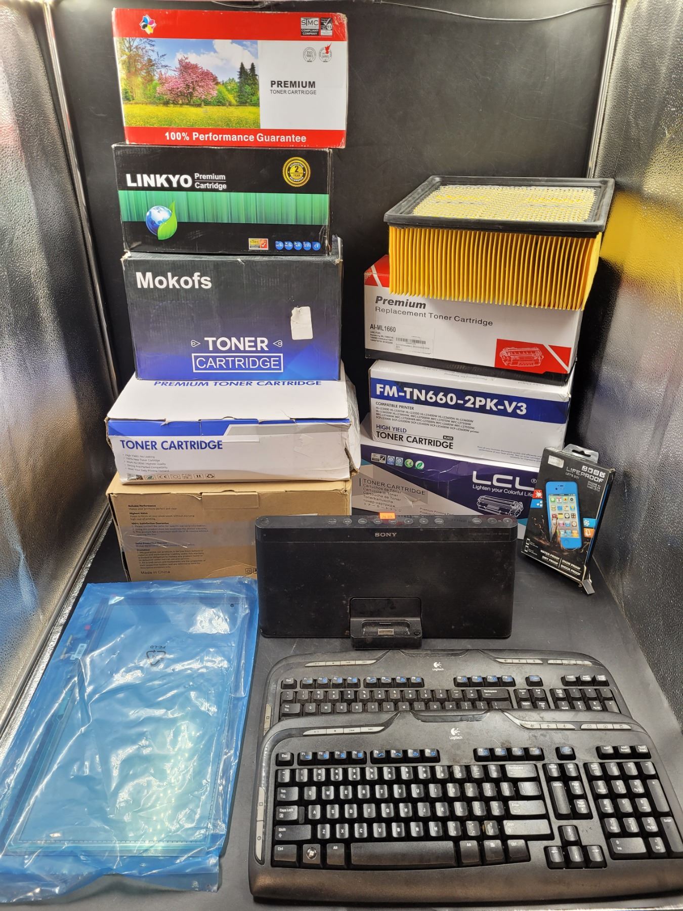 Toner Cartridges, Logitech Keyboards, & Sony Docking System