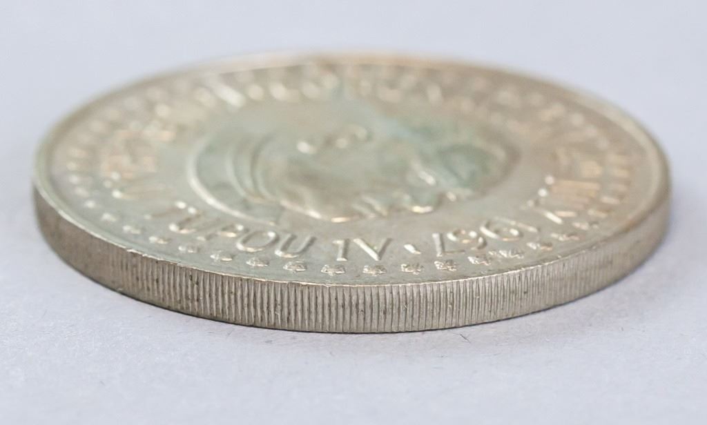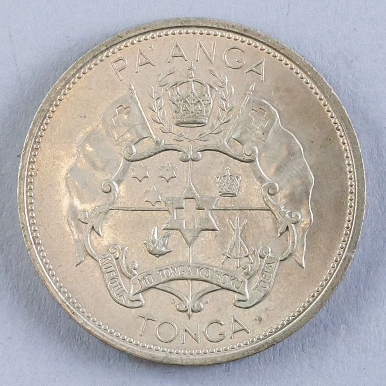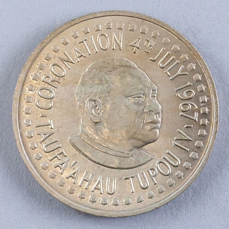 Tongan coin. Commemorating the coronation of Taufa'ahau toupou IV. Obverse: Head of Taufa'ahau Toupou IV. Lettering: CORONATION 4TH JULY 1967 TAUFA'AHAU TOUPOU 1V. Reverse: National Arms. Lettering: PA'ANGA / TONGA. Diameter: 4 cm. 28 grams.
