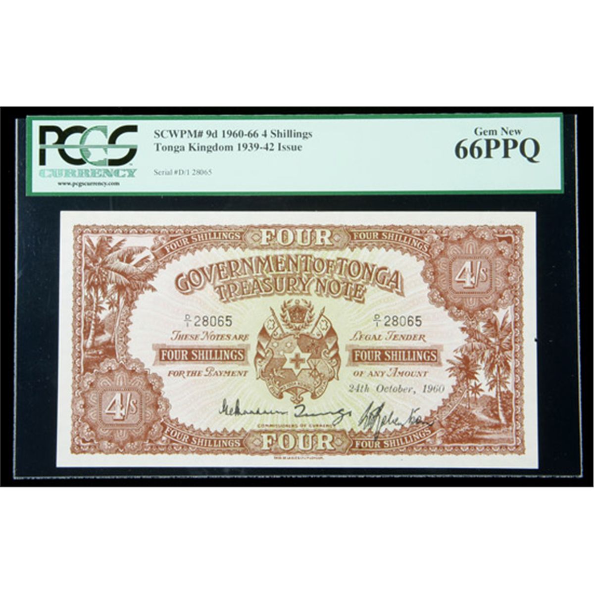 Tonga SCWPM# 9d, 24.10.1960 4 Shillings. PCGS Gem New 66PPQ. . Fr-P-9d. A lovely Gem from this exotic South Pacific locale.