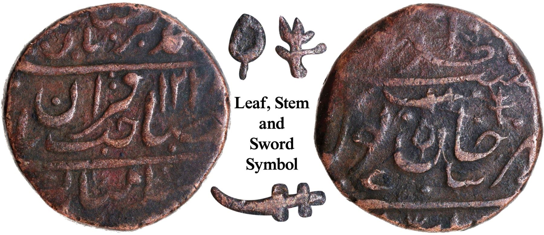 Tonk State, Amir Khan (AH 1213-1250 /1798-1834 AD), Copper Nazarana Paisa, AH 1228, In the name of Muhammad Akbar II, Obv: Persian legend "Sikka mubarak saheb-e-qiran sani Muhammad Akbar Badshah Ghazi" with 1228 Hijri year, Rev: persian legend "Amir Khan, zarb Tonk" off flan at the bottom, leaf, sword & stem symbols, 15.72g, 23.51mm, (Unlisted in KM), about very fine, Very Rare.