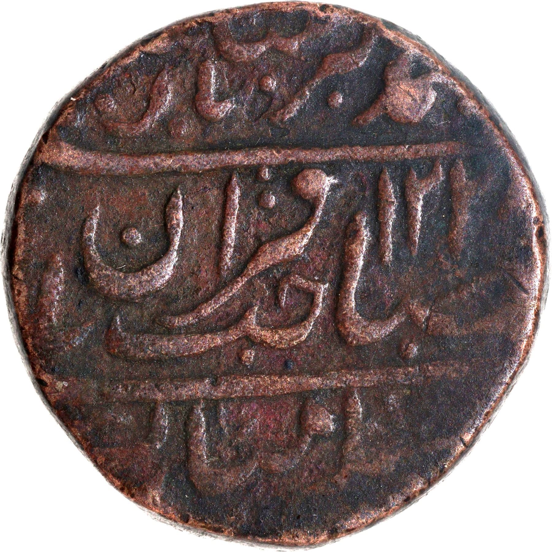 Tonk State, Amir Khan (AH 1213-1250 /1798-1834 AD), Copper Nazarana Paisa, AH 1228, In the name of Muhammad Akbar II, Obv: Persian legend "Sikka mubarak saheb-e-qiran sani Muhammad Akbar Badshah Ghazi" with 1228 Hijri year, Rev: persian legend "Amir Khan, zarb Tonk" off flan at the bottom, leaf, sword & stem symbols, 15.72g, 23.51mm, (Unlisted in KM), about very fine, Very Rare.