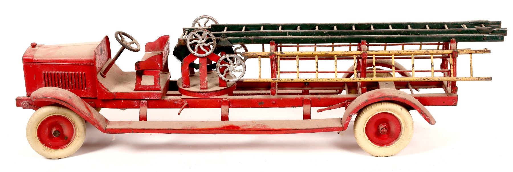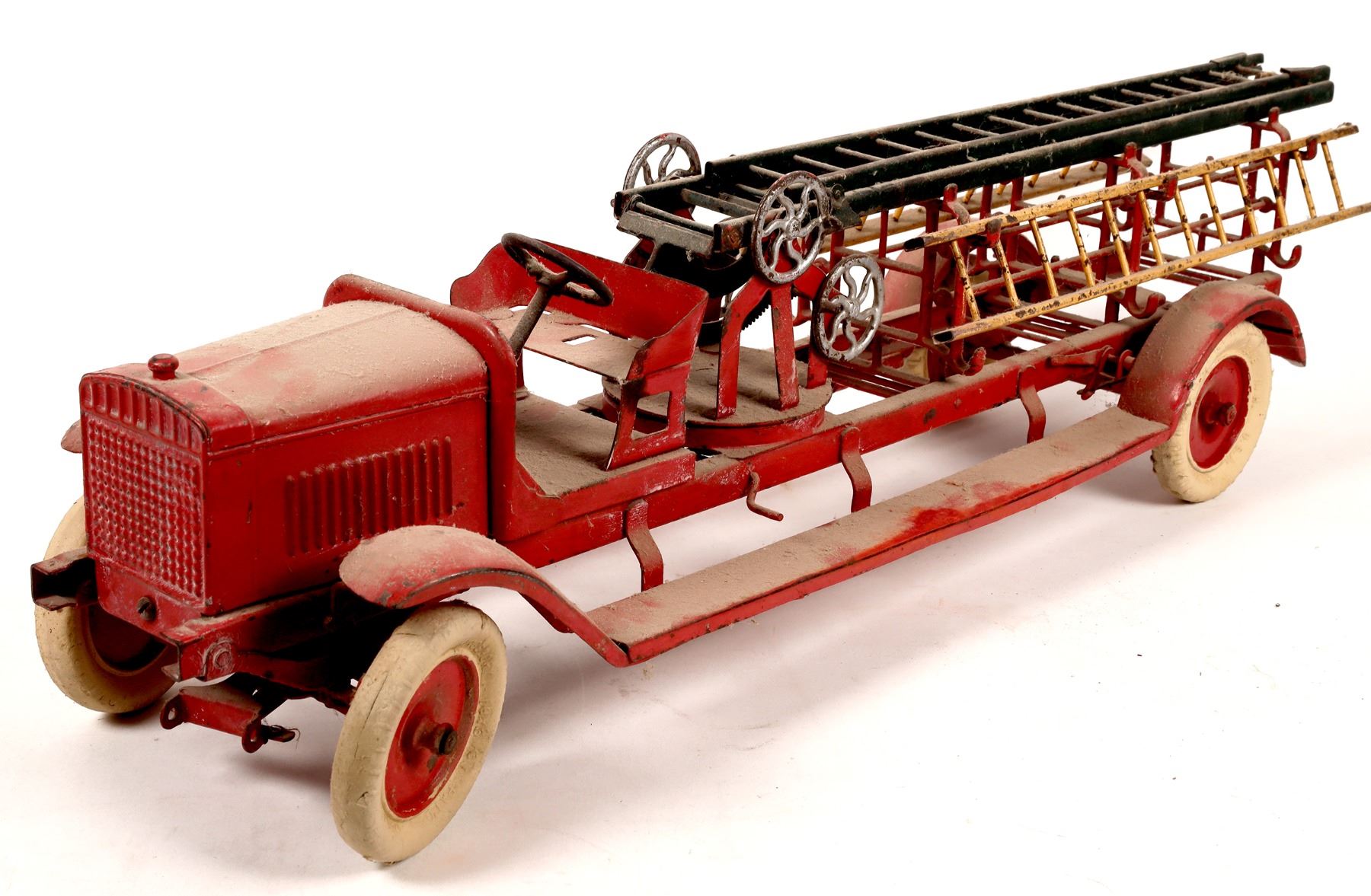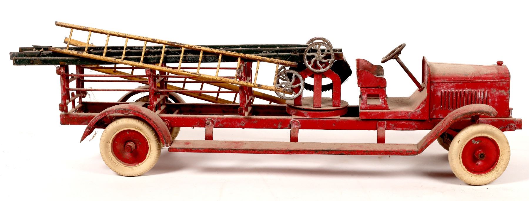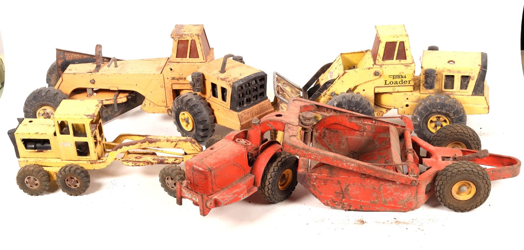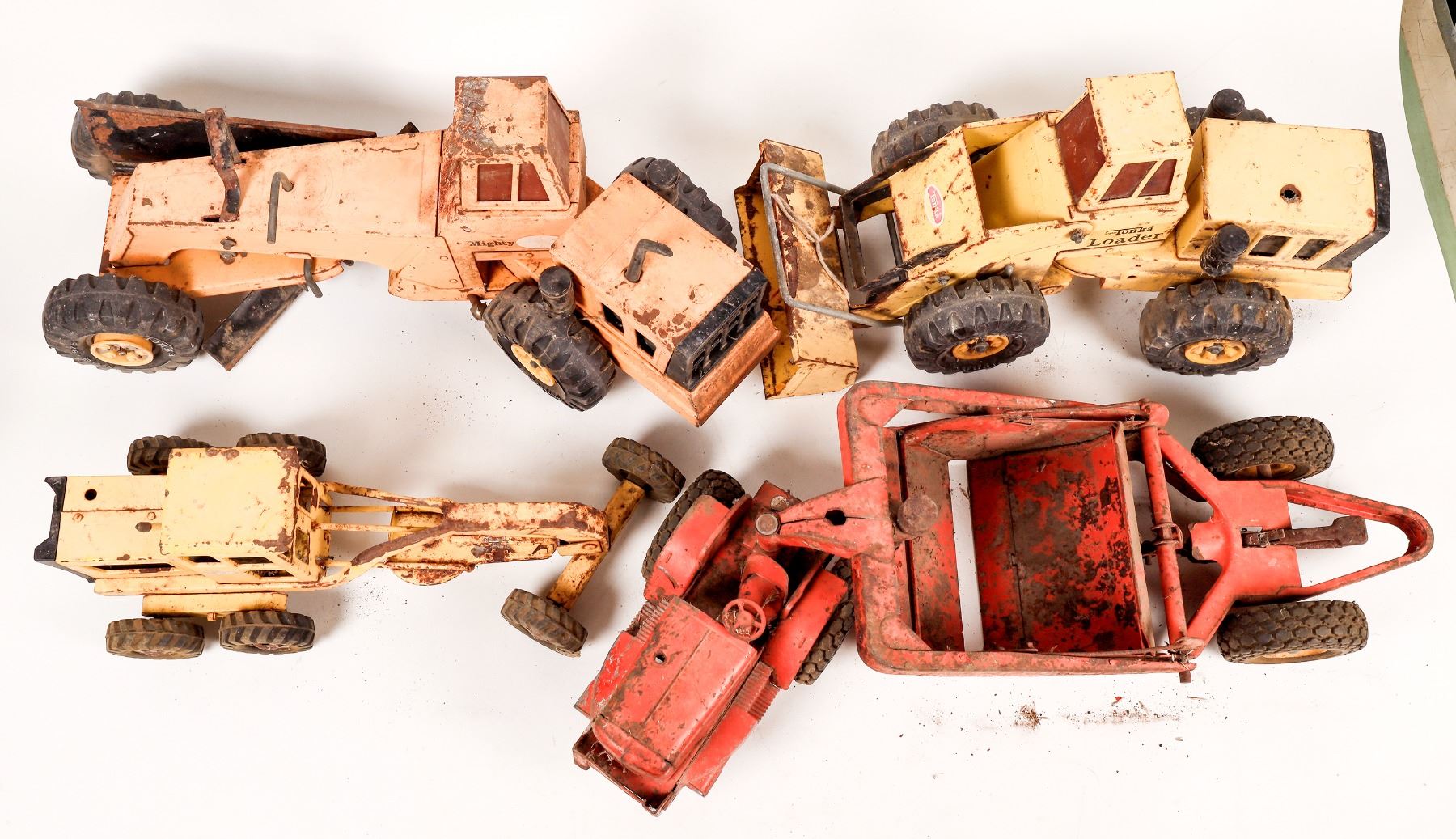 Lot of 5. These are all 17 X 10 ì or larger. All have been in storage for an extended period and need cleaning, have some rust and are missing parts. 1. Tonka Front Loader. 2. Tonka articulated scraper. 3. Tonka articulated grader 4. Tonka road grader (missing blade. %. Kingsbury stamped metal Hook and Ladder fire truck (1914 era truck), missing seat cushion, engine hand crank and ladder gears need cleaning. 1950-60s