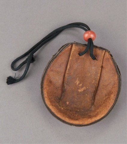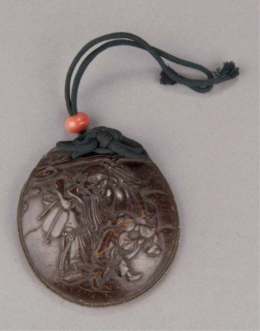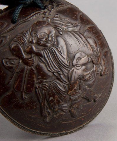 A rare Tonkotsu in tortoiseshell. Late 19th century. The front carved with Hotei playing blind man's bluff with two karako. With a leather back. 3" x 2 4/5". The Helen & Jack Mang Collection Gordon's Antique World Floral Park, NY