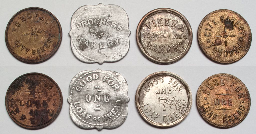 Lot of four. 1) City Bakery of Tonopah. GF one loaf of bread. 2) Vienna Bakery of Tonopah, Nev. GF one loaf of bread. 3) Tonopah City Bakery. GF 1 load of bread. Wear. 4) Progress Bakery. GF one loaf of bread. From the Maish Collection of Nevada Tokens!City: TonopahCounty: NyeState: NVDate:
