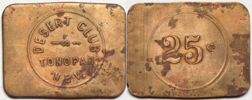 Desert Club / Tonopah / Nev. // 25c. Rectangular. Obverse and reverse have an etched circle. Great piece. Imagine dropping this on the bar counter. More like a "slug" City: TonopahCounty: NyeState: NVDate: c1905-1910