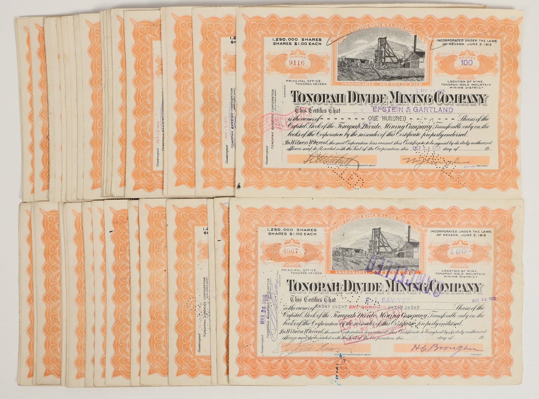 About 70 Tonopah Divide Mining Company Stocks c.1919 Issued, cancelled. G. Brougher signed. Many endorsed on reverse. See photos.