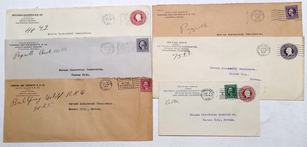 Two Bullfrog-Goldfield Railroad Company corner advertising. Postmarked Los Angeles. Two 1918 Tonopah and Goldfield Railroads. One postmarked Goldfield and the other Tonopah. One Las Vegas & Tonopah corner advertisement postmarked Los Angeles. One Tonopah and Tidewater R. R. Company, Death Valley R. R. Company corner advertisement post marked Los Angeles.