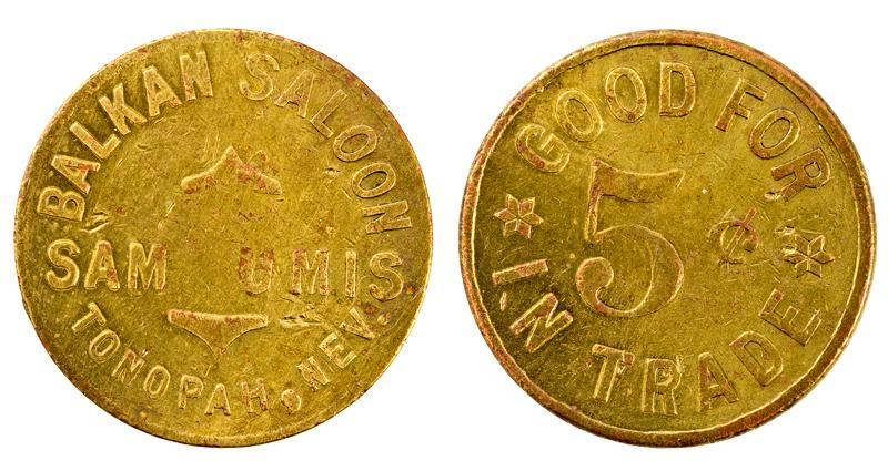 Obverse: Balkan Saloon / Sam Umis / Tonopah, Nev.; reverse: Good For / 5c / In Trade.