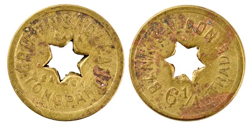 Obverse: Bank Saloon / 6 1/4c In Trade; reverse: Griffin & Holland / Bank / Saloon / Tonopah. Star cutout at center.