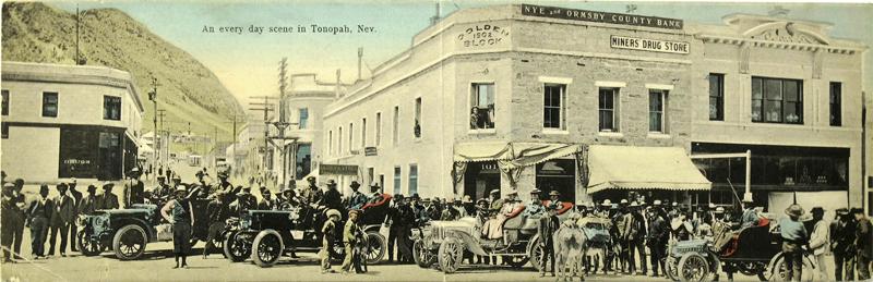 Labeled "An every day scene in Tonopah, Nev." measuring 3.5 x 11." Shows a downtown scene at the corner of Golden Block 1902, including a lively scene with lots of people milling about and four cars posing in the street. Published by the Newman Post Card Co. of Los Angeles, CA.