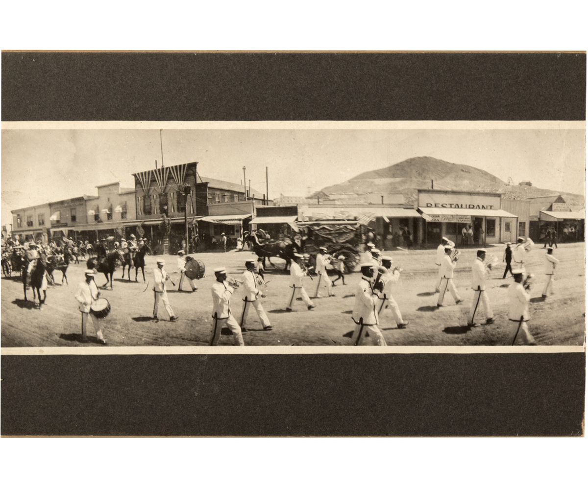The parade scene looks to be celebrating the Fourth of July, judging by the bunting on the buildings along the street. The photo shows 18 or so men of the marching band dressed in white uniforms and playing their instruments. They are followed by mounted riders and carriages. Numerous businesses line the street and bystanders may be seen on the boardwalks. Photo measures 3.75" x 9.25” and is mounted on black mounting board, 6" x 9” . -59677