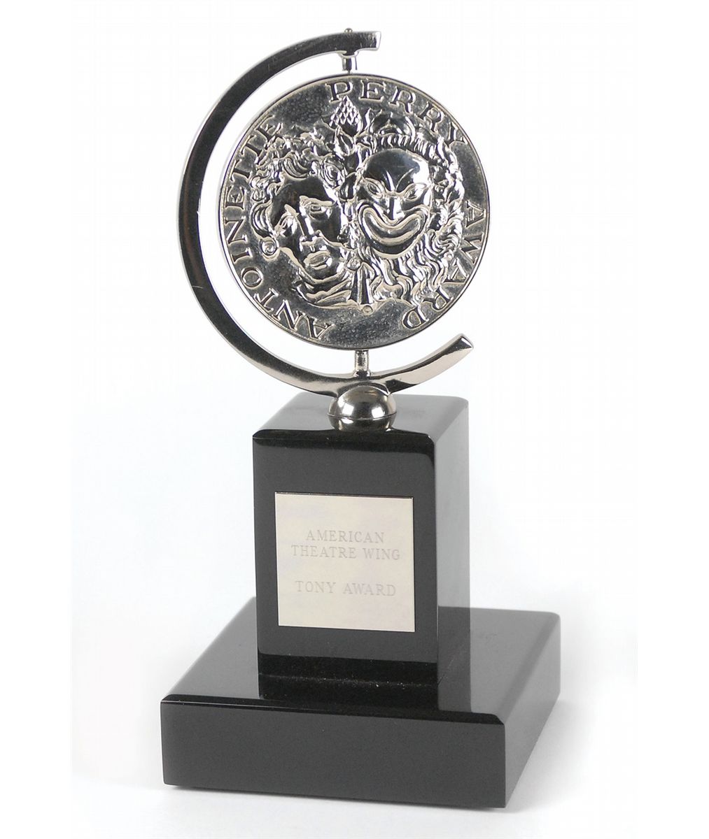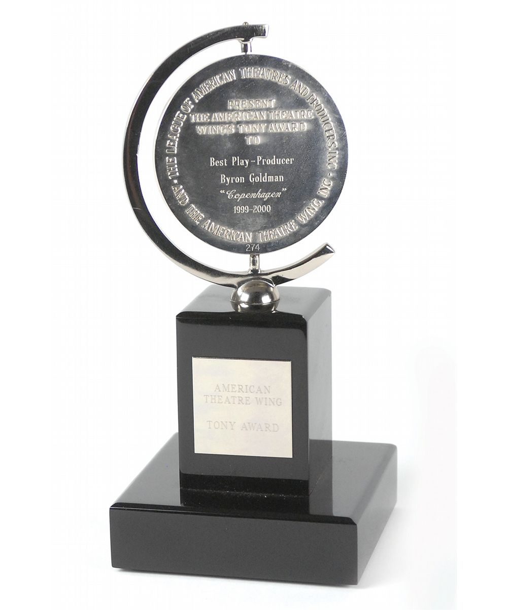 An American Theater Wing Antoinette Perry Award for “Best Play—Producer,” presented to Byron Goldman in 2000 for the play Copenhagen. Award stands 8.5? tall with its black base measuring 3.75 x 3.75. Reverse of the presentation medallion reads: “The League of American Theatres and Producers Inc. and The American Theatre Wing Inc. Present The American Theatre Wing’s Tony Award to[:] Best Play—Producer Byron Goldman ‘Copenhagen’ 1999–2000.” In fine condition. Based on a 1941 meeting between physicists Niels Bohr and Werner Heisenberg, Copenhagen had its world premiere at the National Theatre in London in 1998. It opened on Broadway at the Royale Theatre in April of 2000 and ran for 326 performances, winning the Tony for Best Play, Best Featured Actress, and Best Direction of a Play. This award originates directly from the family of garment industry executive and theatrical producer Byron Goldman, a three-time Tony Award-winner. Goldman’s Broadway career began in 1946 and continued for decades, with his production credits including Hello, Dolly!, The Real Thing, and his final production, Copenhagen.