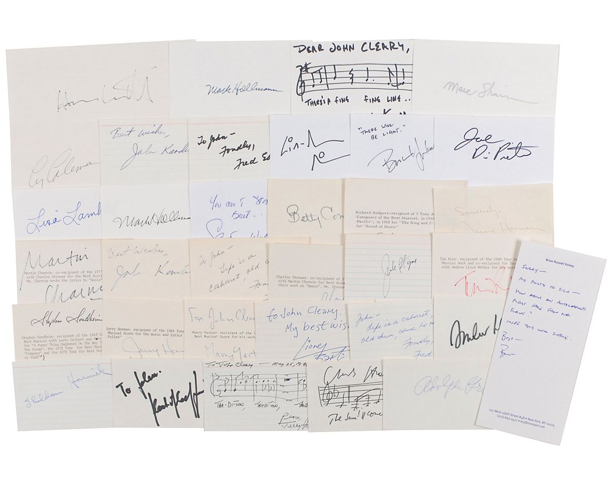 Collection of approximately 34 items, primarily consisting of signatures as well as a few AMQSs, each signed in ink by a winner of the Tony Award for Best Original Score from between 1962 and 2010. Signers are: Lionel Bart, Jerry Bock, Martin Charnin, Cy Coleman, Betty Comden, Joe DiPietro, Fred Ebb (3), Adolph Green, Adam Guettel, Sheldon Harnick, Jerry Herman (2), Mark Hollmann (2), John Kander (2), Lisa Lambert, Robert Lopez and Jeff Marx, Lin-Manuel Miranda, Tim Rice, Richard Rodgers, Claude-Michel Schonberg, Marc Shaiman, Stephen Sondheim, Charles Strouse (2), Jule Styne, Andrew Lloyd Webber, Scott Wittman, Maury Yeston, and Brian Yorkey (2). In overall fine condition.