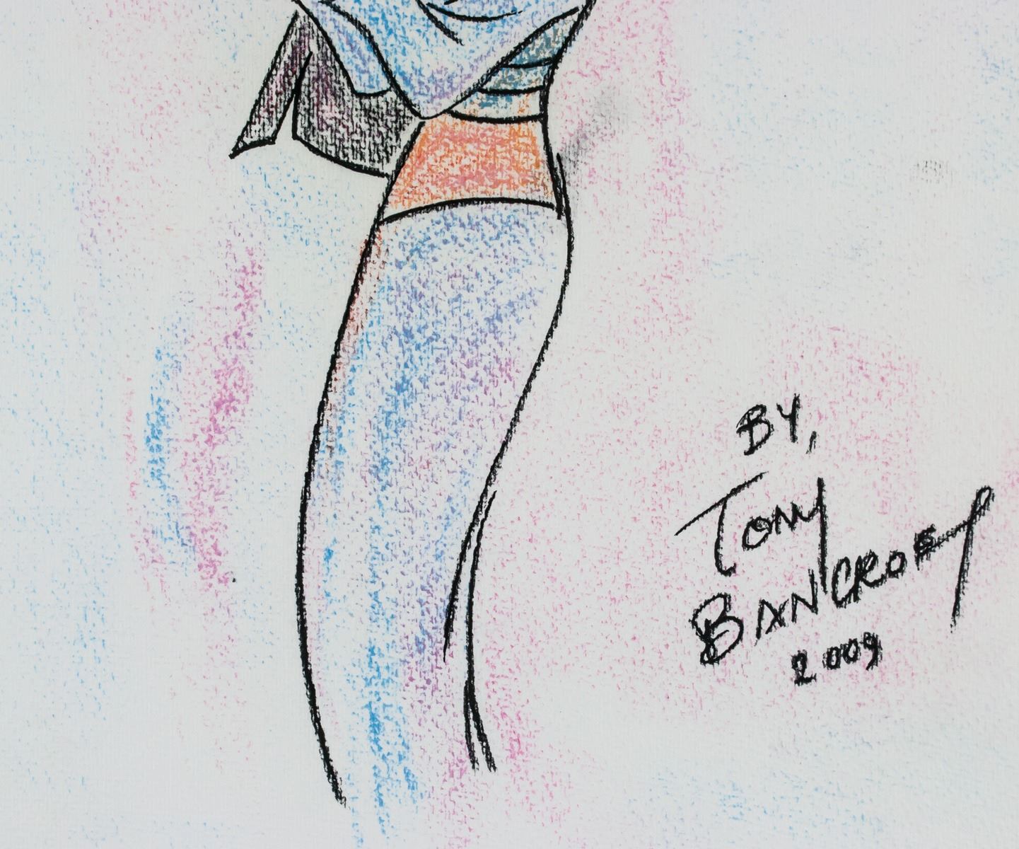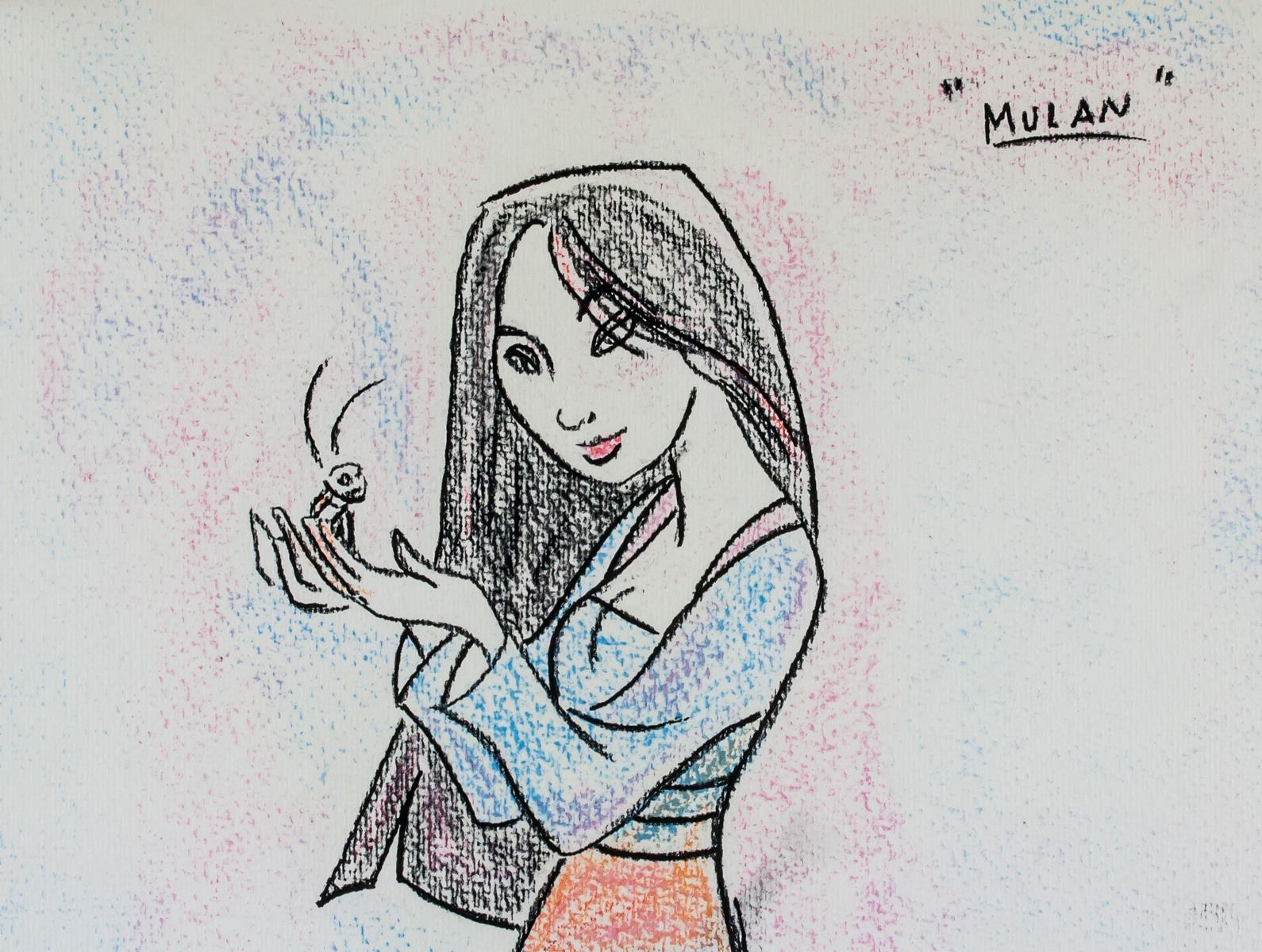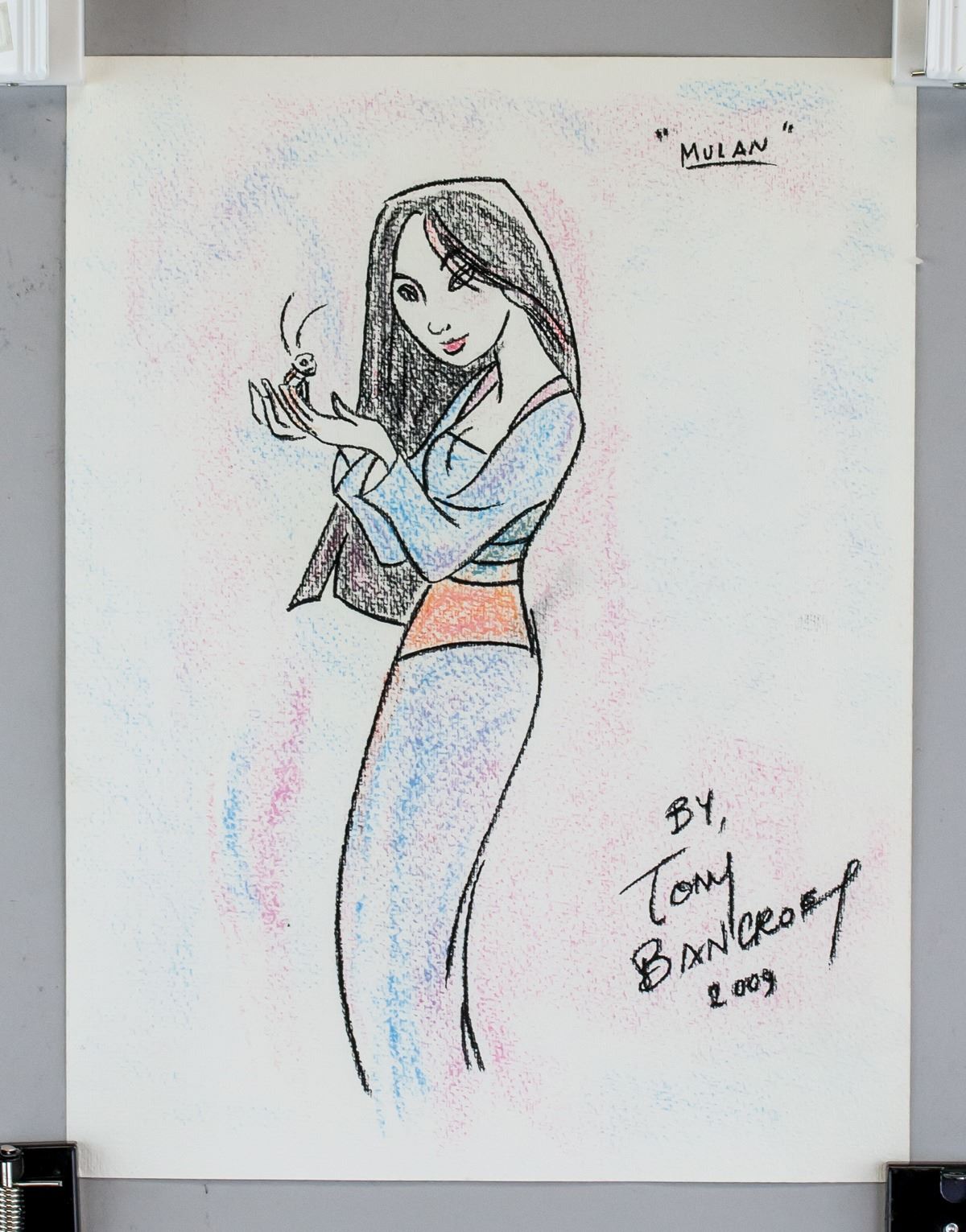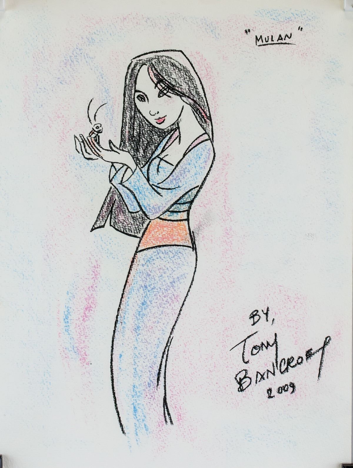 Mixed media on paper, unframed. Featuring potrait of mulan holding cricket. Inscribed with "MULAN" in top right corner, signed Tony Bancroft in bottom right. Inscribed with 2009 beneath signature. Attributed to Tony Bancroft (born 1967, American). 32 x 34 cm (12.5 x 9.5 in). PROVENANCE: Southern Ontario estate