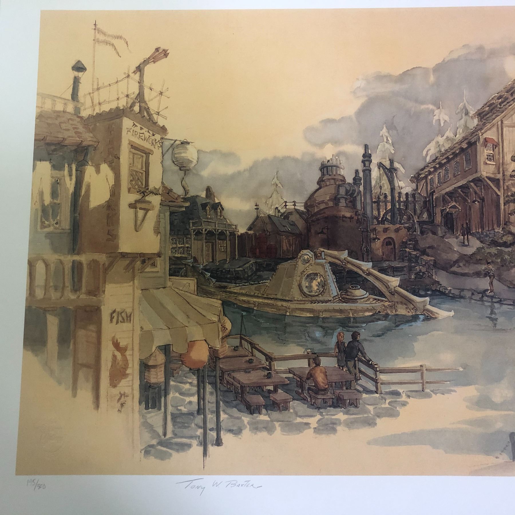 (Disneyland Gallery, 1990) A beautiful concept art print featuring Tony Baxter's concept for Disneyland's never-realized land "Discovery Bay". Created by the Disney Gallery, this print faithfully recreates Baxter's concept and features the Disney Gallery logo embossed on the lower left corner. This print is signed by Baxter in pencil on the lower-left area, and is hand-numbered 195/300. Notice the difference in Baxter's signature, in comparison to other signatures. This style of signature is rarely seen. This concept piece includes the original Disneyland Gallery Certificate of Authenticity, which is also rare in itself. The print measures approximately 38" x 20". Normal wear from handling. Overall in really nice condition. Item comes with a Grand Circle Tour Auctions COA as well.
