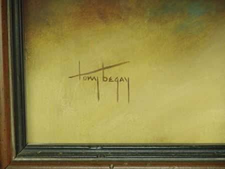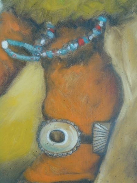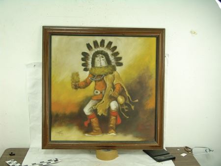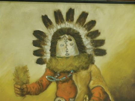 Ca. 1970s, Rare signed original oil on canvas featuring a fully costumed dancer. This is hard to find work by this talented, but short-lived, artist from Chinle, Arizona. Very good condition. Framed. 25" x 25" (30" x 30" framed)