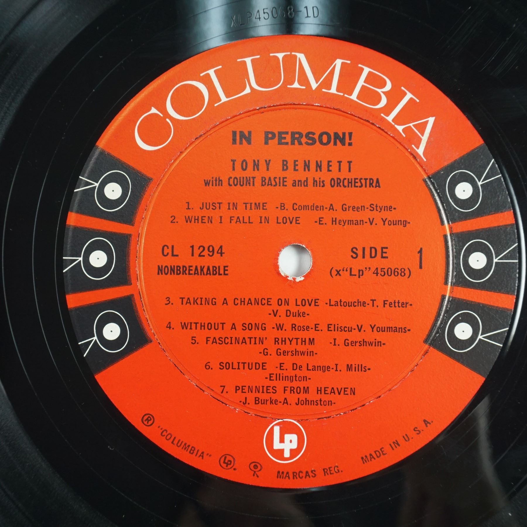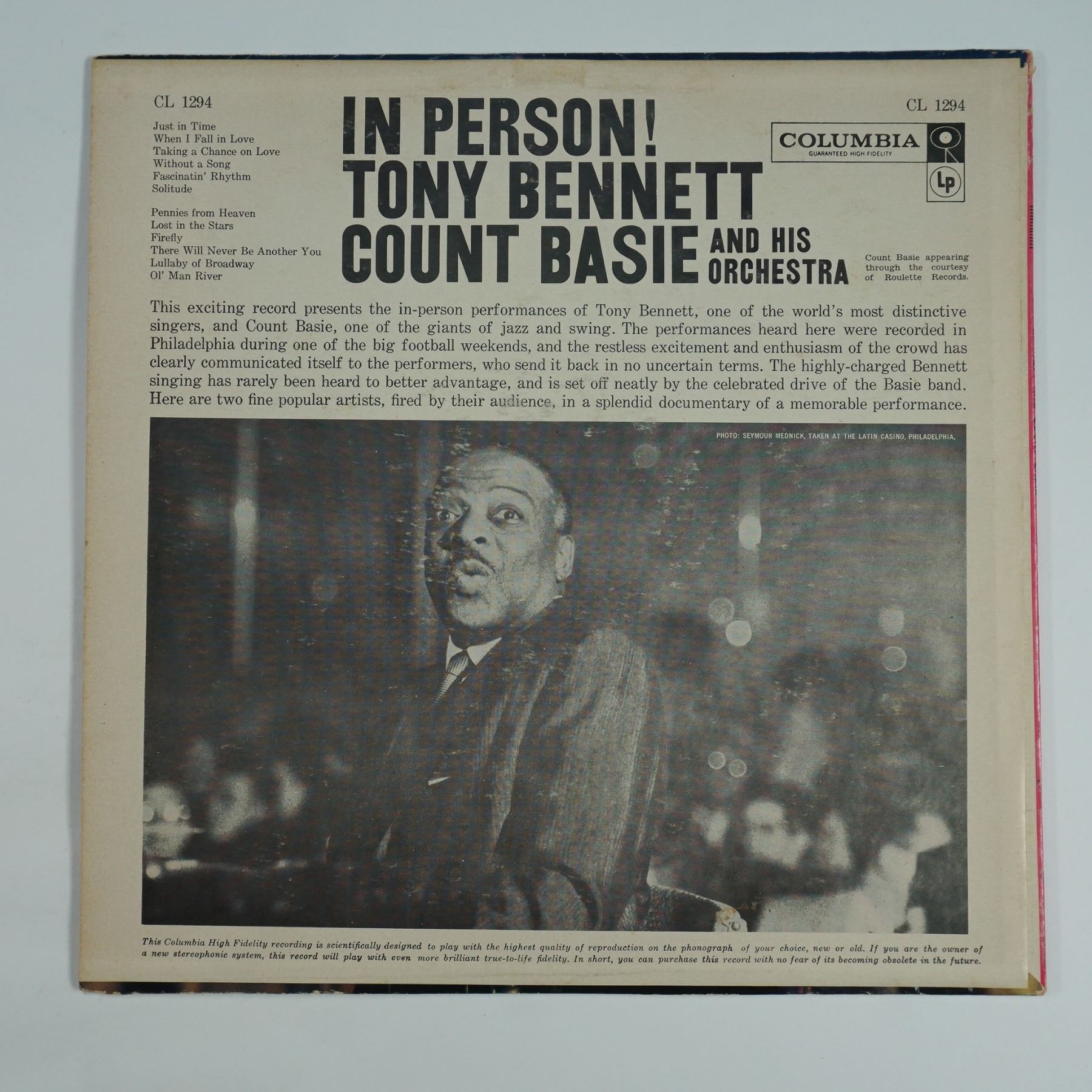 This classic jazz album, In Person, features Tony Bennett backed by Count Basie and His Orchestra, capturing the energy of a live performance. Released in 1959 on Columbia Records, this LP showcases Bennett's smooth vocals alongside Basie's legendary swing arrangements. The album includes standout tracks like Just in Time and Lullaby of Broadway, bringing the vibrant atmosphere of their dynamic collaboration to life. A sought-after piece for jazz enthusiasts and vinyl collectors alike.