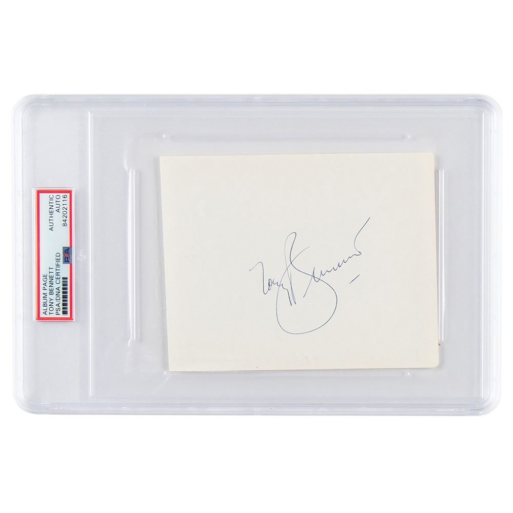 Ballpoint signature of the legendary singer, "Tony Bennett,& rdquo; on an off-white 5.5 x 4.5 album page. In fine condition. Encapsulated in a PSA/DNA authentication holder.